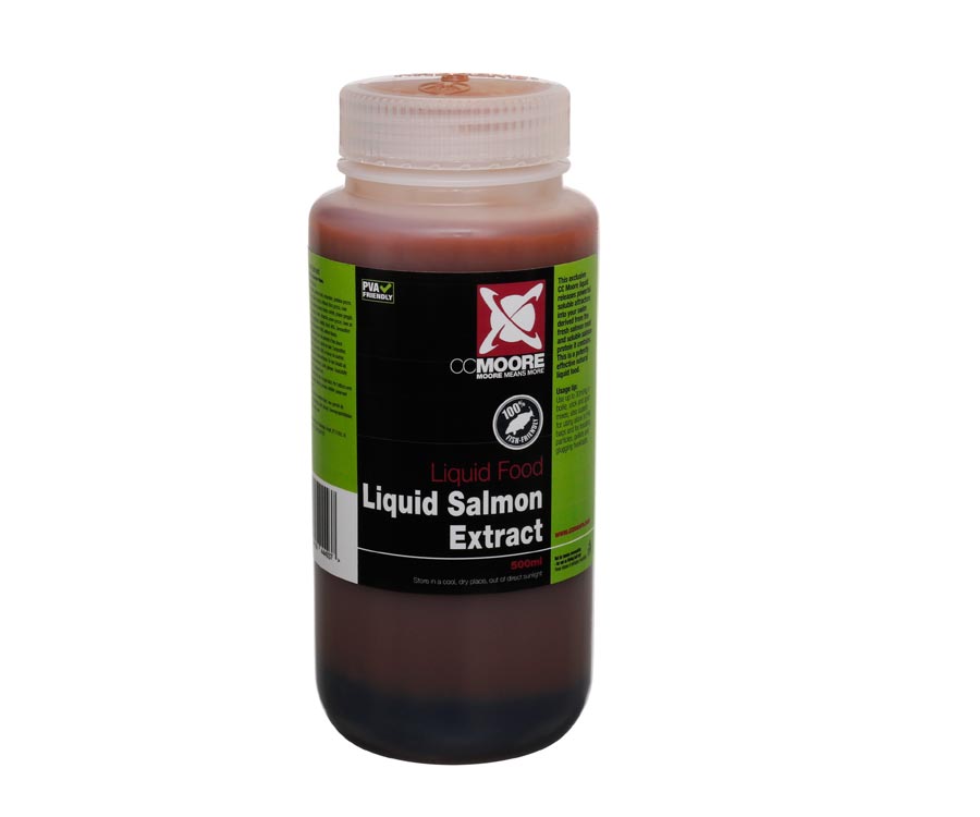 В состав ликвида CC Moore Liquid Salmon Extract входит мелкоизмельченное филе лосося, экстракт лосося, 20 различных аминокислот, таурин и различные белки. Все эти компоненты образуют уникальный и натуральный продукт, характеризующийся высокой пищевой ценностью, а также насыщенным ароматом и вкусом. Содержащиеся в ликвиде маленькие кусочки лососевого мяса, попадая на дно озера или реки, распространяются во всех слоях воды в зоне ловли.