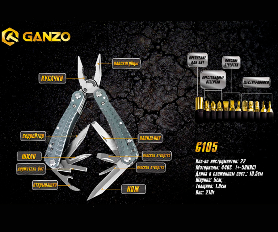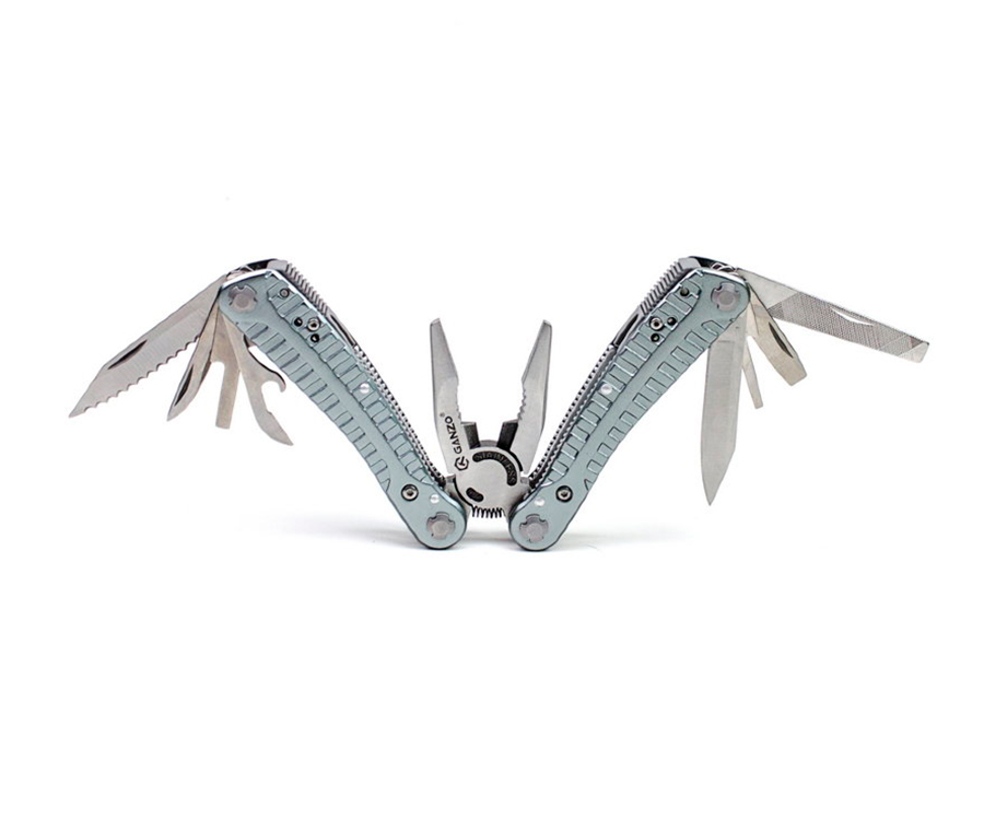 Удобный полноразмерный мультитул G105 от компании Ganzo. Большой набор инструментов позволяет использовать модель G105 для полноценного ремонта разнообразной техники. В комплект мультитула G105 входят следующие инструменты: подпружиненные плоскогубцы с кусачками, два лезвия, одно из которых имеет серрейторную заточку, две плоских отвертки разного размера, напильник, линейку, удлинитель для адаптера, консервный нож.