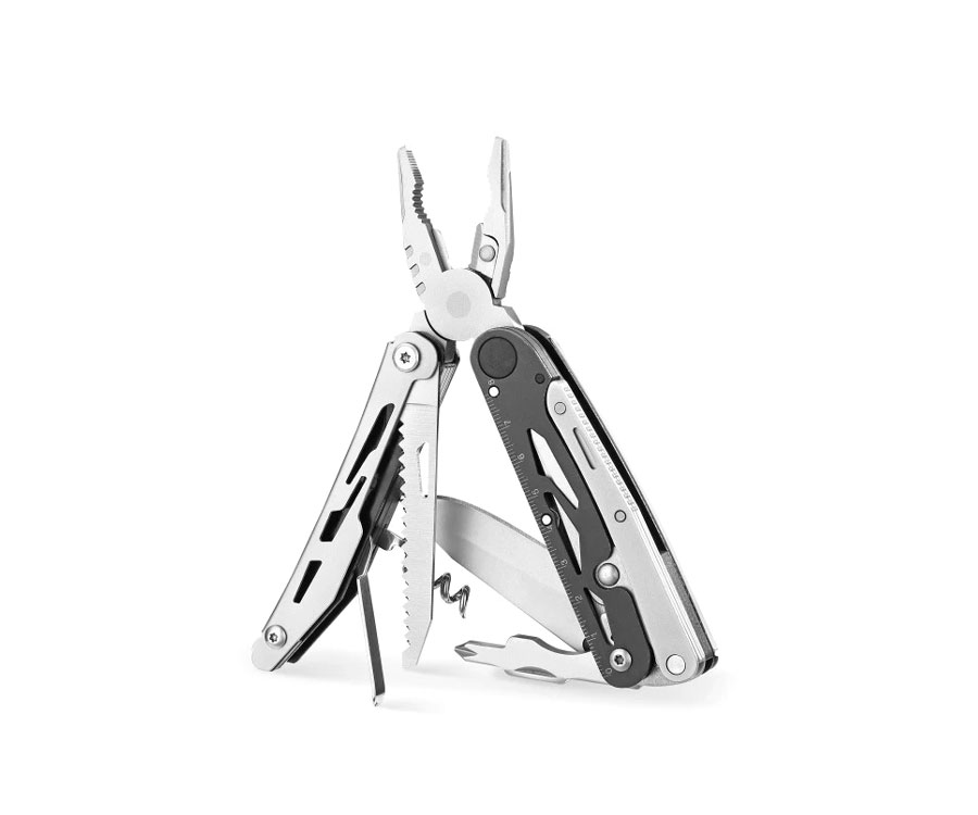 конструкция включает клинок с прямым лезвием, пилу с серрейторной заточкой, крестообразную отвертку, штопор;