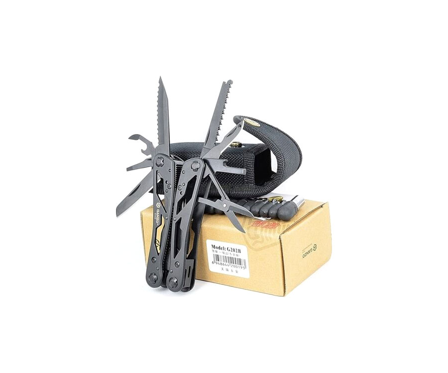 MultiTool Ganzo G202B – современный полноразмерный мультитул черного цвета от китайской компании Ganzo на 24 инструмента. Прекрасный выбор для тех, кто хочет, чтобы все необходимые инструменты всегда были под рукой. Компактный и легкий мультитул поможет вам в самой неожиданной ситуации. Ручка и все инструменты выполнены из нержавеющей стали, поэтому Ganzo G202В отличается не только высоким качеством, но и имеет привлекательный внешний вид. Его размеры в сложенном виде 10,5х5х1,8 см. Все инструменты изготовлены из стали 440С, что обеспечивает им высокую степень прочности и стойкости к коррозии. С мультитулом Ganzo G202B можно выполнить самые разнообразные виды работ. 12 сменных насадок в комплекте подойдут практически для всех видов винтов, а с помощью ножей и ножниц при необходимости можно разрезать даже очень плотные материалы. За счет небольшого веса и размера мультитул G202B можно использовать в качестве брелока. Черный цвет изделия делает его стильным и привлекательным.