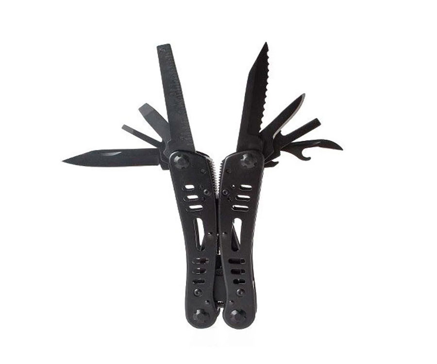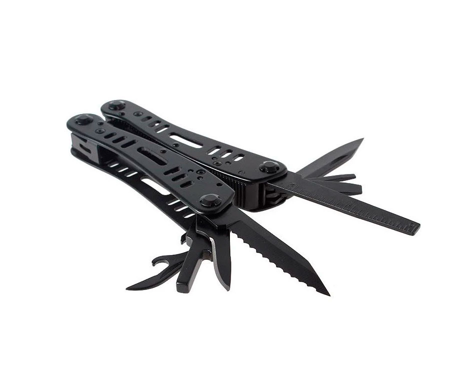 Мультитул Ganzo G103 вполне оправдывает звание «карманной мастерской». При весе 248 г и длине в сложенном виде 10,5 см, он обладает 22 функциями. Этот инструмент поможет устранить неисправности велосипеда, туристического снаряжения, экипировки охотника или рыболова. Да и в быту он пригодится не единожды. Одно из преимуществ мультитула Ganzo G103 – наличие полноценных плоскогубцев с мощными подпружиненными губками, встроенными кусачками для проволоки и ребристым захватом для предметов круглой формы. Помимо того, в рукоятках мультитула размещаются: открывалка, две плоские и крестообразная отвертки, шило, линейка, на обратной стороне которой – напильник, два ножа (гладкий и с серрейторной заточкой). Также имеется держатель для бит с квадратным сечением. Сами же биты прилагаются в отдельном органайзере: 8 сменных насадок и переходник. Все инструменты изготовлены из нержавеющей стали 440С, которая отличается хорошим балансом коррозийной стойкости и твёрдости. На инструменты нанесено стойкое черное матовое покрытие. Для хранения мультитула и бит предусмотрен плотный тканевый чехол.