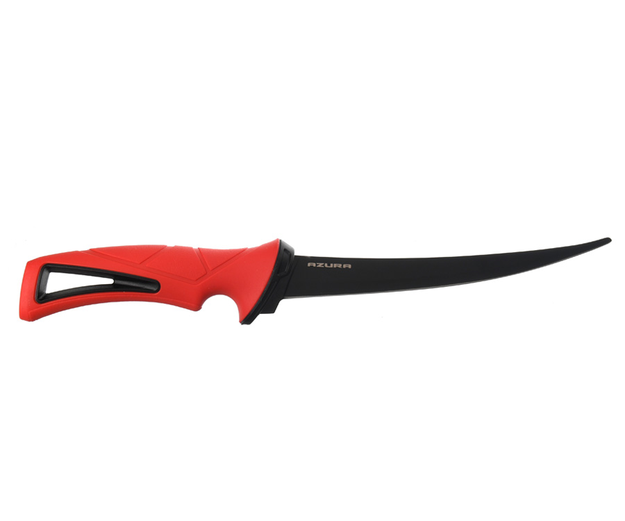- Филейный нож Azura. Лезвие ножа из японской нержавеющей стали 420J2 имеет тефлоновое покрытие, которое защищает клинок от коррозии и обеспечивает его лёгкую очистку. Рукоять не скользит в мокрой руке, выполнена из полипропилена, для максимальной безопасности оснащена небольшой гардой. Ножны изготовлены из пластика, легко моются. Длина ножа – 35 см.