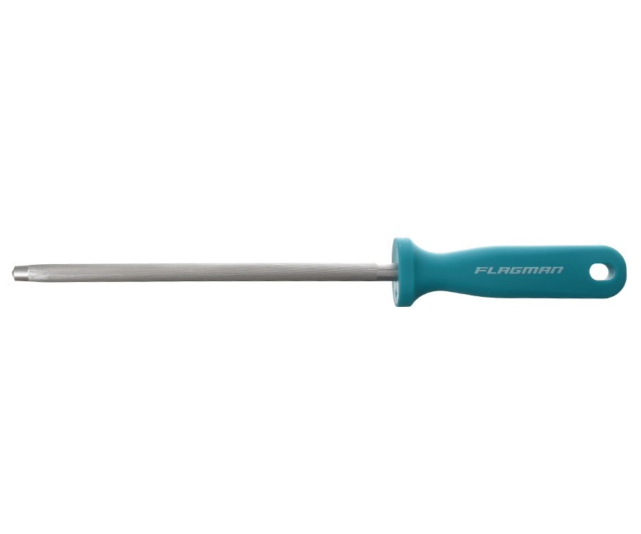 2. Точилка для ножей (мусат) с мелкой насечкой будет служить вам долгие годы. Позволяет быстро выправить режущую кромку и вернуть лезвие к первоначальному виду. Несколько движений после каждой операции (или нескольких часов работы) и нож приобретает первозданную остроту. Отлично продуманная рукоять из полипропилена удобно лежит в руке. Длина: 32 см.