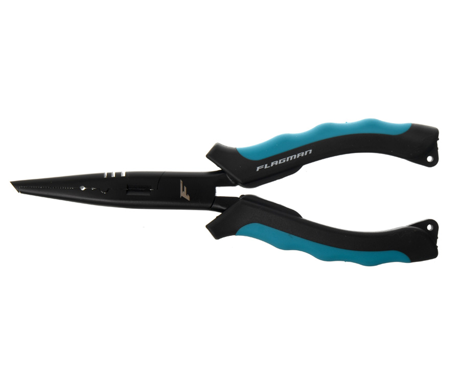 4, 5. Плоскогубцы + чехол на ремень. Оснащены длинными губками, что делает их идеальным инструментом для извлечения глубоко засевших крючков. Изготовлены из высококачественной углеродистой стали с тефлоновым антикоррозийным покрытием. Оборудованы кусачками. Также имеют зубец для разжимания заводных колец и приспособление для зажимания обжимных трубочек. Прорези различной ширины помогут подогнуть петельку воблера, крючок или элемент оснастки, а обрезиненные ручки позволят комфортно работать, удерживая плоскогубцы в мокрой руке. Длина: 18 см.