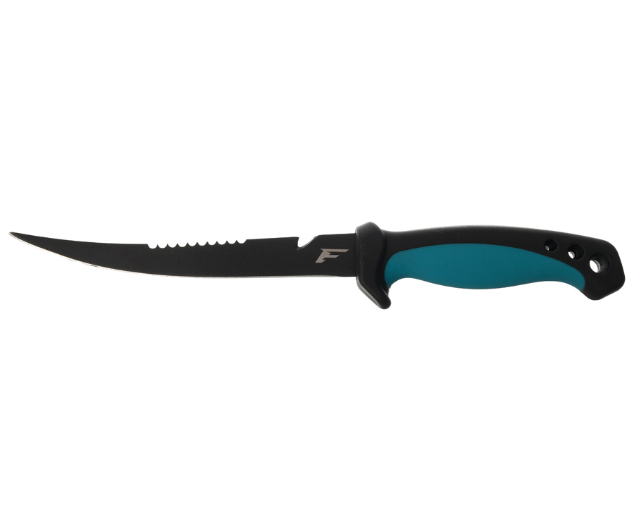 1. Филейный нож. Лезвие из нержавеющей стали имеет тефлоновое покрытие, которое защищает клинок от коррозии и обеспечивает его легкую очистку. Рукоять для максимальной безопасности оснащена небольшой гардой и нескользящей в мокрой руке резиновой вставкой. Сверху клинка расположены серрейтор и стропорез. Ножны выполнены из пластика, легко моются. Длина клинка – 16 см. Общая длина ножа – 28,5 см. Вес – 83 г.