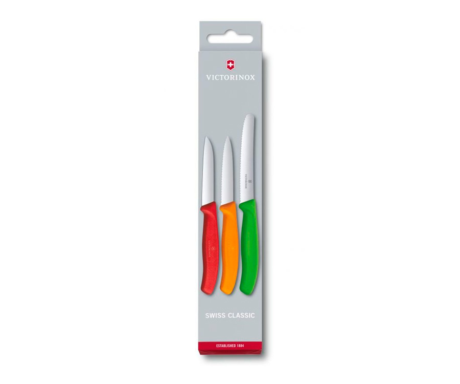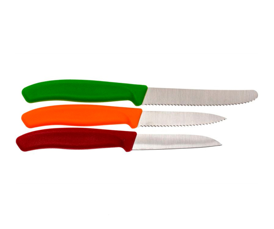 Кухонный набор Victorinox SwissClassic Paring Set 3 ножа с цветными ручками (6.7116.32): этот набор добавит цветов на вашей кухне. Радужные яркие оттенки не только красивы, но еще и полезный и необходимый инструмент для кухни. Три ножа – прекрасное сочетание. Их не слишком много, но это именно те ножи, которые всегда нужны на любой кухне. Большой серрейтор прекрасно нарежет хлеб, сыр и колбасу. Маленькие ножи всегда найдут работу: гладкий – легко очистит фрукты, овощи и коренья, а серрейтор поможет легко их нарезать, не повредить нежную мякоть, а также без усилий нарежет твёрдый корнеплод.