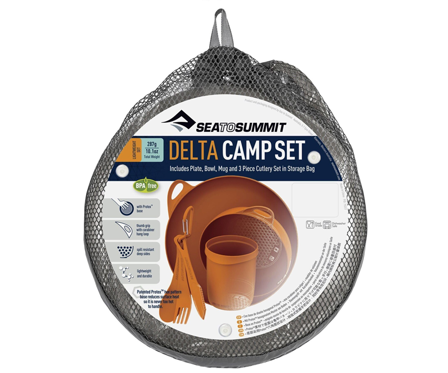 Набор посуды Sea to Summit Delta Camp Set – состоит из шести предметов. Включает всю необходимую посуду для отдыха на природе: тарелка, миска, кружка и набор столовых предметов. Набор изготовлен из качественного пищевого пластика (полипропилена), не содержит бисфенол А, можно мыть в посудомоечной машине. Посуда удобно складывается в специальный сетчатый мешочек, который идет в комплекте. Набор прочный, легкий и компактный, обязательно пригодится любителям туристических походов или пикника.