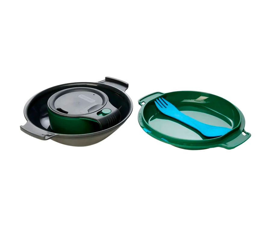 В комплект входят: миска, тарелка, чашка с крышкой, вилка, ложка, зубочистка. Миска и тарелка надежно запираются для удобства транспортировки. Отверстие на ручке для карабина. Посуда изготовлена из прочных, безопасных для здоровья материалов, которые легко моются и устойчивы к повреждениям. Все элементы набора легко укладываются в компактный кейс, что делает его удобным для транспортировки и хранения.
