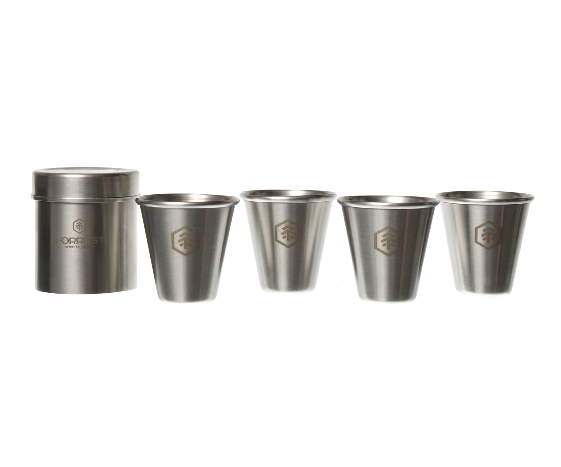 Forrest Glass – набор из 4 стопок ёмкостью 50 мл каждая. Стопки изготовлены из пищевой нержавейки и компактно вкладываются друг в друга, занимая минимум места. Тубус-чехол из нержавеющей стали с плотно закрывающейся крышкой обеспечивает компактное хранение, удобную транспортировку и надёжную защиту стопок Forrest Glass от повреждений. Набор послужит прекрасным подарком для рыболовов, охотников, любителей кемпинга и отдыха на природе.