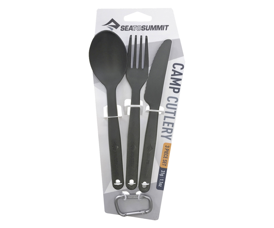 Набор столовых приборов Sea to Summit Camp Cutlery Set – состоит из трех предметов. Изготовлен из прочного анодированного авиационного алюминия. Анодирование позволило изготовить прочные и суперлёгкие столовые приборы. Набор весит всего 37 грамм, имеет приборы классической формы, имеют гладкую матовую поверхность. Оболочка, закаленная анодированием, отлично герметизирует алюминий, что предотвращает выщелачивание в пищу. Для удобной транспортировки в комплект входит карабин. Столовый набор прочный, легкий и долговечный, обязательно пригодится во время туристического похода или пикника.