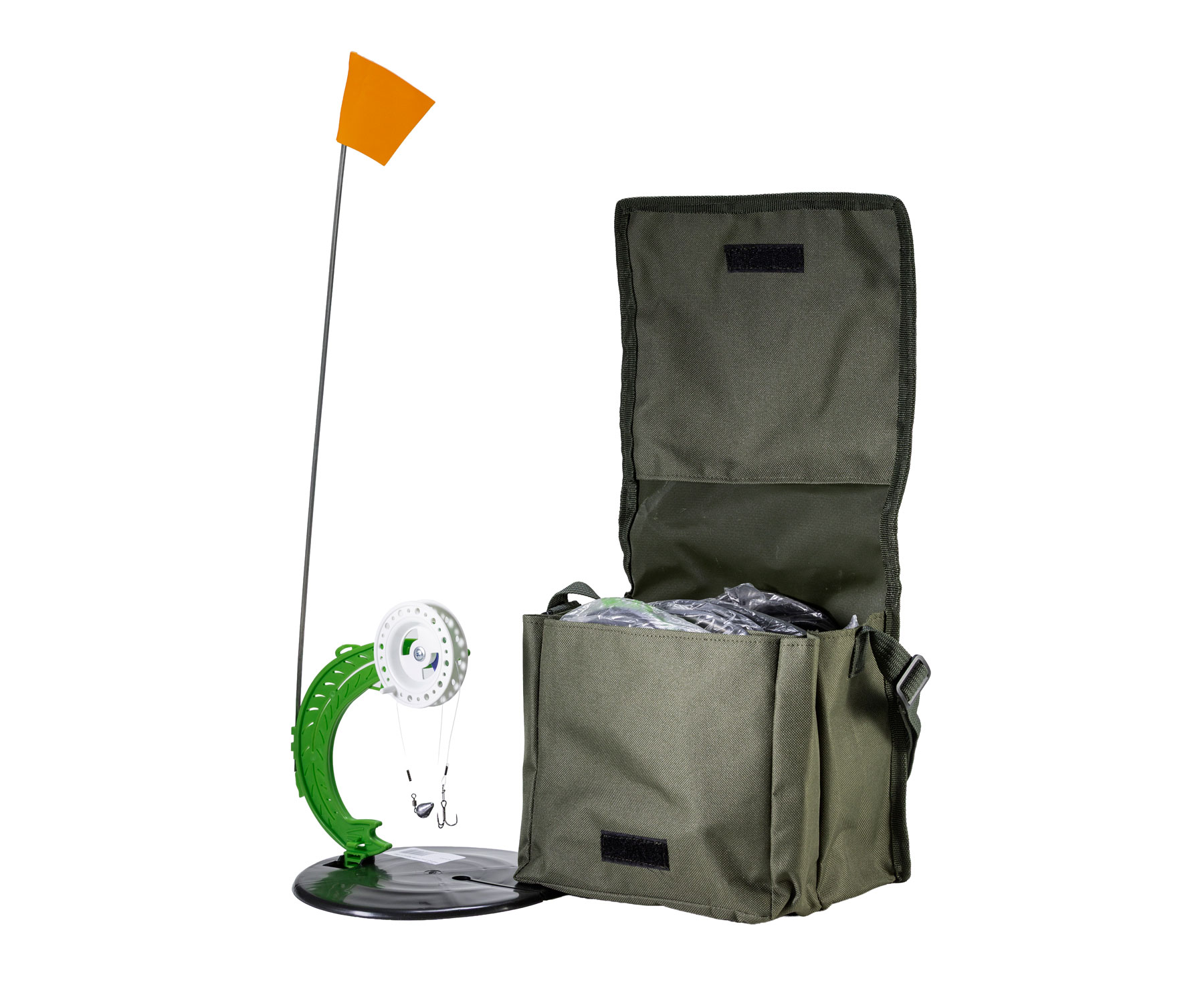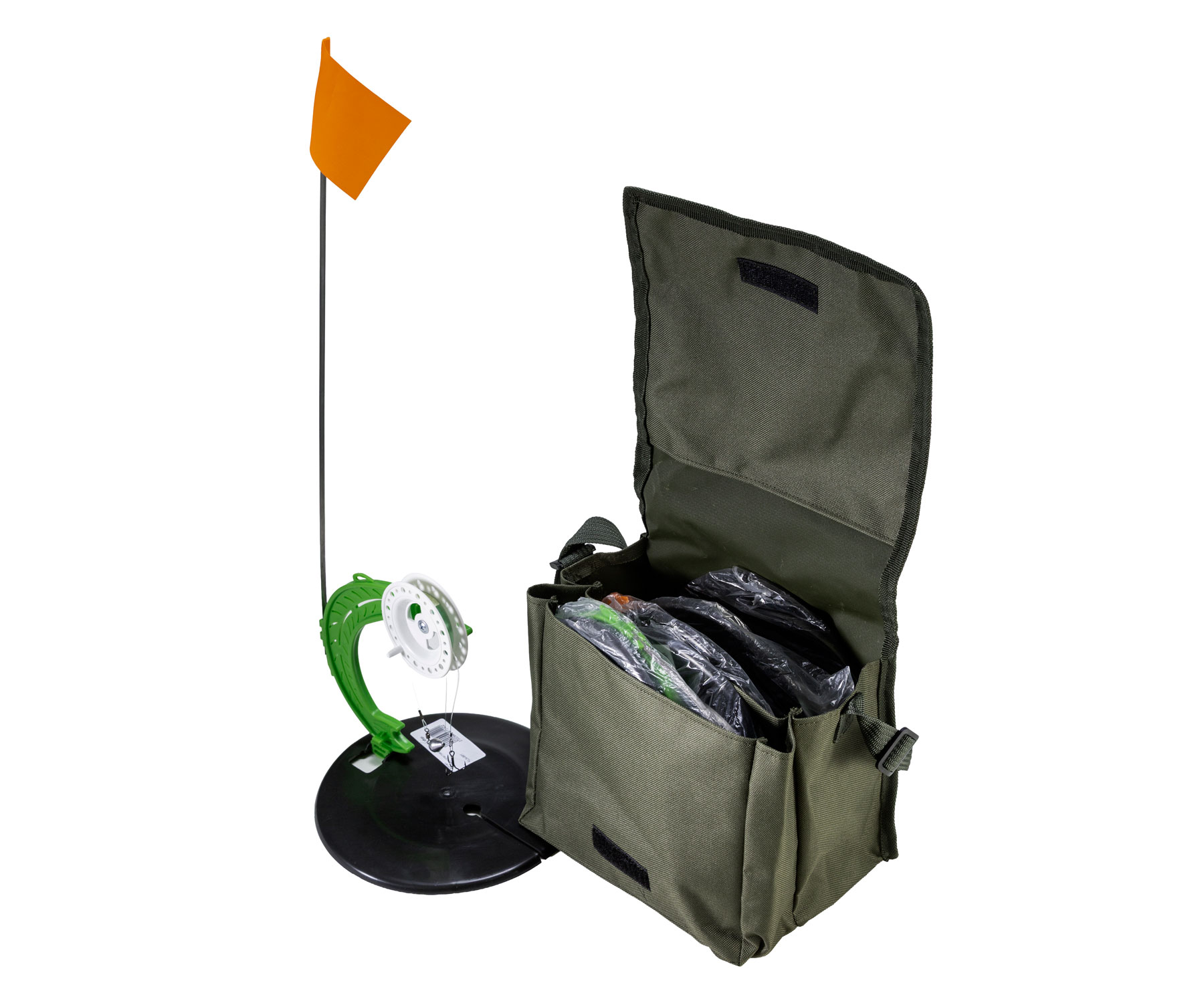 Компактный и эффективный набор из 5 полностью оснащённых зимних жерлиц и рыболовной сумки от Flagman – это готовое решение для успешной подлёдной ловли хищника. В комплект входят 5 качественно оборудованных жерлиц, каждая из которых оснащена катушкой с леской, грузилом, поводком из флюорокарбона 0,55 мм, тройником и ярким флажком – всё, что нужно для быстрого выхода на лёд и начала рыбалки. Основания жерлиц выполнены из морозостойкого и прочного пластика, устойчивого к нагрузкам и низким температурам. Конструкция жерлиц обеспечивает их надёжную фиксацию на льду и продуктивную ловлю в разных погодных условиях. Жерлицы компактно складываются в специальную рыболовную сумку, где их удобно хранить и транспортировать. Для переноски сумки с жерлицами служит регулируемый наплечный ремень.