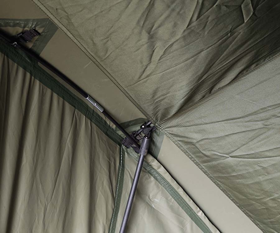 - удерживающие удилище ремни, несколько отверстий под колышки для регулировки высоты шелтера, шляпка натяжения с прорезиненной герметизированной прокладкой