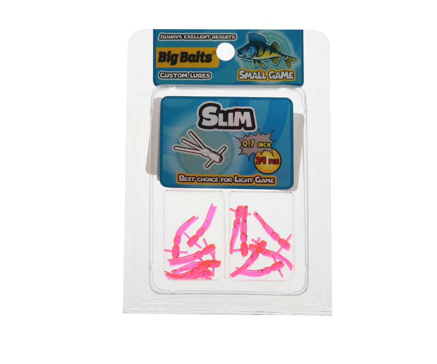 Силиконовая приманка Big Baits Slim 0,7" имеет небольшое тело оригинальной формы в виде личинки насекомого с трёхлучевым удлинённым хвостом, создающим микроколебания и провоцирующим на атаку даже самую пассивную рыбу. Микроприманка Big Baits Slim создана для нано джига и зимней ловли. Несмотря на свой миниатюрный размер она привлекает как крупную, так и мелкую рыбу. Big Baits Slim изготовлена из очень мягкого эластичного материала, имеет ярко выраженный натуральный запах, который дополнительно усиливает её привлекательность. Выпускается в размере 0,7 дюйма с различными расцветками, свечением и без. Рекомендуется хранить приманки в оригинальной упаковке, что придаёт им долговечности и длительное время сохраняет запах аттрактанта. В упаковке: 24 шт.