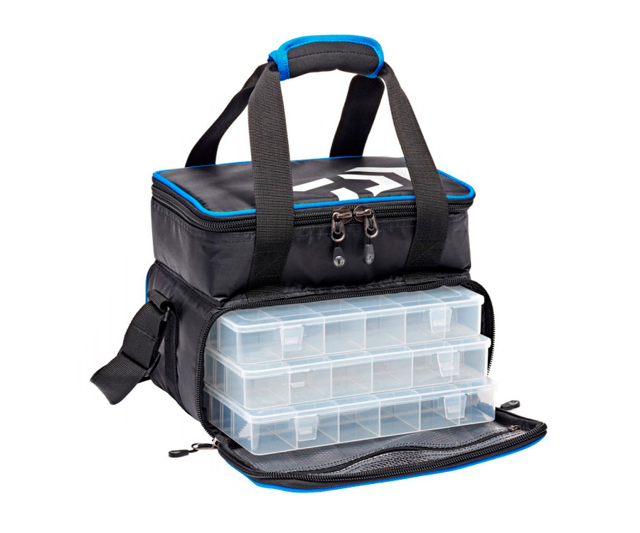 Сумка Daiwa N'zon Feeder Bag M – в этой рыболовной сумке с усиленным дном достаточно места для хранения снастей и снаряжения, которые могут понадобиться во время фидерной рыбалки. В нижнем отделении размещены 3 пластиковых бокса для снастей, кормушек и аксессуаров. С внутренней стороны крышки отсека имеется прозрачный карман на молнии для документов, ключей и т.п. Верхнее мягкое отделение можно разделить на 2 секции с помощью съёмной перегородки на липучке. Внутри крышки имеется прозрачный карман на молнии для мелких вещей, телефона и т.п. Прорезиненное дно предотвращает проникновение влаги снизу сумки. Для транспортировки сумки Daiwa N'zon Feeder Bag предусмотрены прочные ручки и регулируемый наплечный ремень.