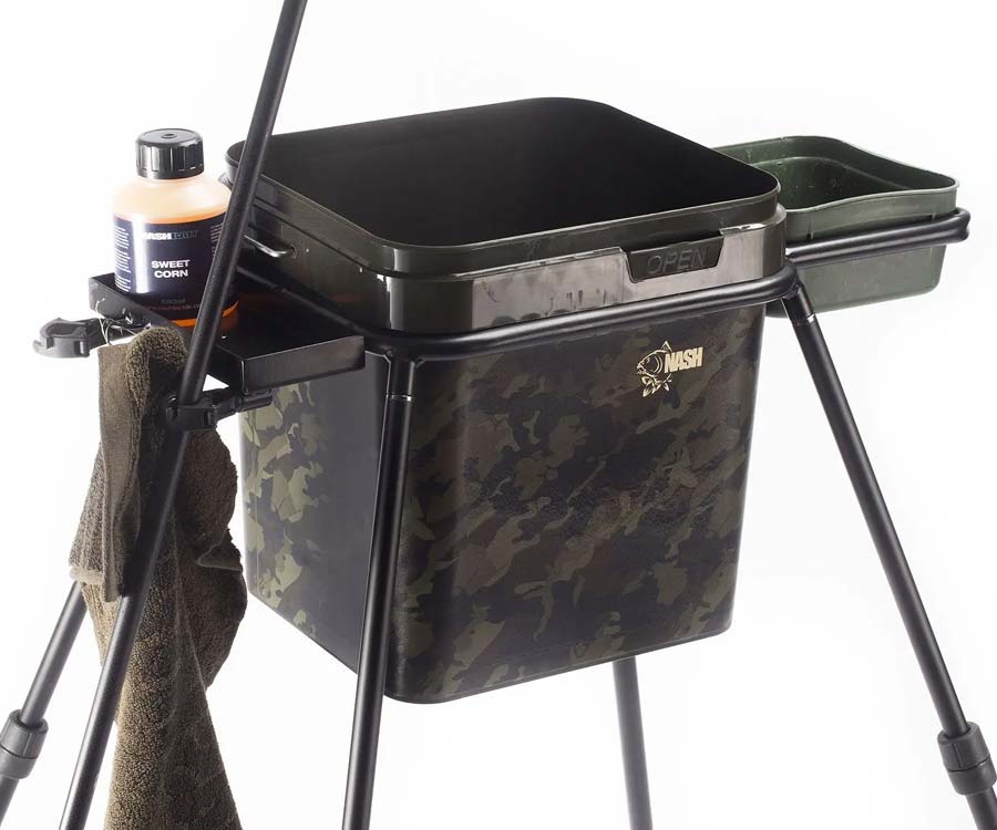 Nash Spod Station – подставка для ведра, которая состоит из основного отделения (рамка под ведро 24,5х27,5 см), куда устанавливается ведро для прикормки Nash на 10 или 17 литров, и маленького отделения для небольшого контейнера, например, с водой или уже готовыми стиками. На боковой прямоугольный металлический столик можно положить насадку, инструменты и прочее. Сбоку столик имеет крюк для полотенца или сумки для сушки бойлов, металлическую петлю для связанных поводков и два резьбовых отверстия, на которые можно прикрутить держатели удилищ. Подставка Nash Spod Station имеет четыре точки крепления для стоек, что делает ее очень устойчивой. Ведра и стойки (ножки) в комплект не входят. Размеры Spod Station: 58x28 см.