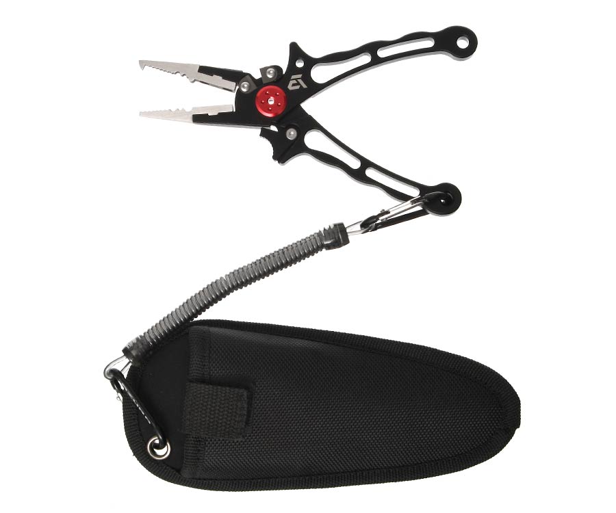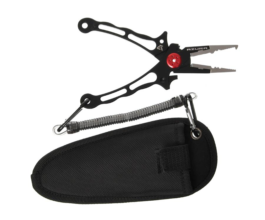 Многофункциональные плоскогубцы Azura Safina Multifunction Pliers идут в комплекте с чехлом и пружинным витым ретривером, который предотвращает потерю инструмента. Плоскогубцы изготовлены из прочного сплава. Они имеют специальный «зуб» для разжимания заводных колец и приспособления для зажимания обжимных трубочек. Также Azura Safina Multifunction Pliers оборудованы резцами из карбида вольфрама, которыми без проблем можно перекусить леску или шнур. Резцы съемные, их легко заменить в случае необходимости (запасные приобретаются отдельно). Плоскогубцы имеют защитное покрытие из карбида титана. Эргономичные полиуретановые накладки позволяют комфортно удерживать инструмент в руке и работать с ним. Прочный полужесткий чехол оснащен лямкой на липучке, которая не позволяет выпасть инструменту при ношении. Крепится на пояс, причем, пошив чехла позволяет носить его как вертикально, так и горизонтально. Для крепления ретривера чехол оснащен люверсом. Пружинный ретривер позволяет закрепить рыболовный инструмент на жилете, ремне, в лодке и т.п. С двух сторон он оснащен надежными алюминиевыми карабинами.