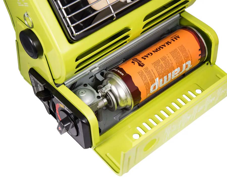 Tramp UTRG-037 – портативный газовый обогреватель с керамическим нагревательным элементом. Это надёжное, эффективное и безопасное решение для обогрева палаток, уличных шатров, автотрейлеров, павильонов и небольших помещений дачного типа. Обогреватель снабжён клапаном контроля давления газа и устройством настройки защитного картриджа, а также удобной ручкой в верхней части корпуса для переноски. Обогреватель Tramp UTRG-037 оборудован дополнительным предохранителем самопроизвольной подачи газа и включения пьезоподжига. Перед включением пьезоподжига нужно вытянуть за кольцо предохранительный рычаг из боковой части корпуса, поджечь газ, затем вернуть предохранительный рычаг в прежнее положение отпустив кольцо.