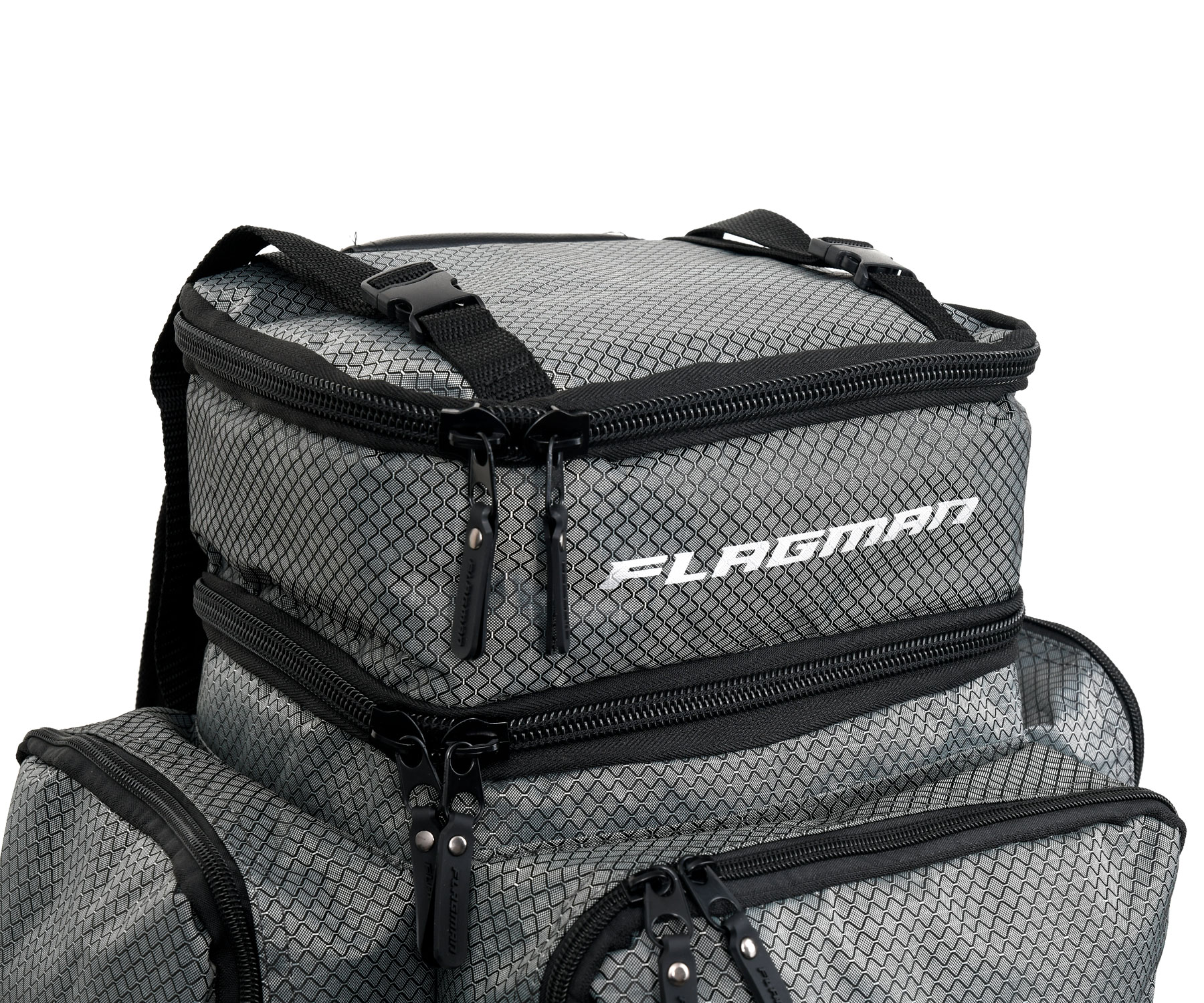 Flagman Pro Competition Ruckback – практичный и компактный рюкзак, предназначенный для транспортировки и хранения рыболовных снастей, снаряжения, насадок и прикормок. Выполнен из прочного армированного водонепроницаемого материала Oxford 600D. Рюкзак Flagman Pro Competition Ruckback имеет два отделения. Верхнее – это полноценная термосумка, которая закрывается на двустороннюю молнию и в которой удобно транспортировать скоропортящиеся прикормки, насадки, продукты питания. Нижнее отделение подойдёт для одежды, рыболовных снастей и снаряжения. Также оно имеет внутренний прозрачный карман на молнии для ценных вещей и документов и закрывается при помощи двусторонней молнии. Кроме того, Flagman Pro Competition Ruckback имеет три вместительных наружных кармана, фиксаторы навесного снаряжения на застёжках фастекс и усиленное водонепроницаемое дно. Для переноски рюкзака предусмотрены регулируемые мягкие лямки и прочная ручка. Размеры: 23x17x40 см.