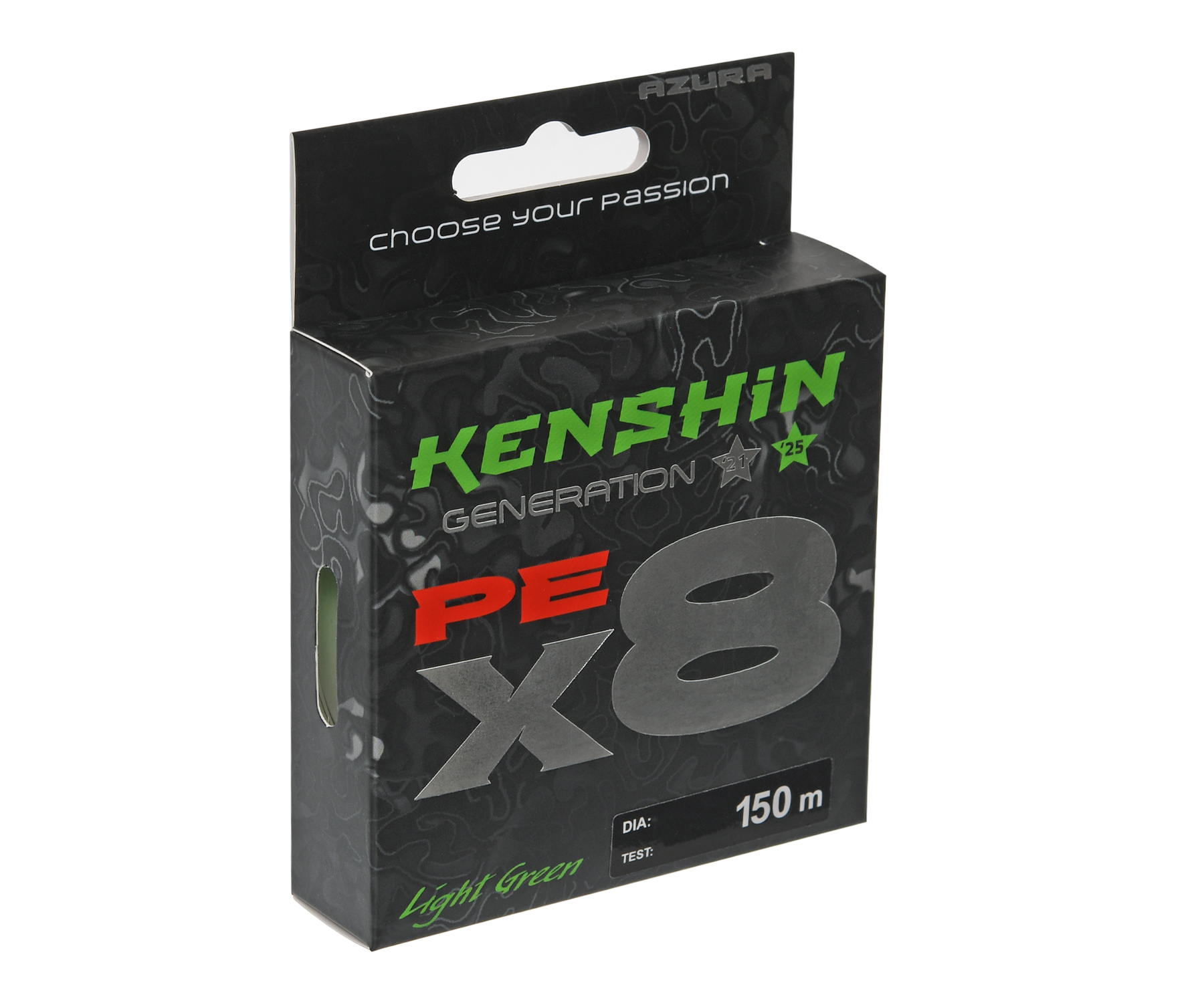 '25 Kenshin X8 #0.8 – 0.148 мм 150 м 5.6 кг – 12.4 lb. Эта модель призвана стать любимой среди рыболовов, которые хотят получить качественный продукт за небольшие деньги. Качественная и надёжная восьмижилка в бюджетном исполнении.