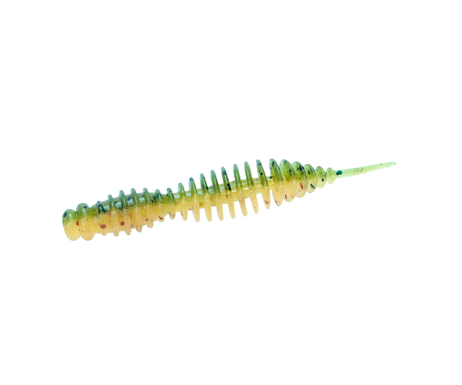 Широкие ребра при тонком теле делают Air Worm очень подвижным в воде. На разных стилях анимации приманка смотрится очень живо и аппетитно для рыбы. Даже на коротких рывках в придонной зоне слаг извивается всем телом и имеет колебания тонкого хвостика. А на равномерной проводке все тело идет змейкой и очень заметно трясет хвостом. Это можно видеть, когда мы делаем оборот катушкой и разгоняем приманку в классической проводке "два оборота-стоп". Такая тряска приманки дополнительно провоцирует рыбу на атаку.