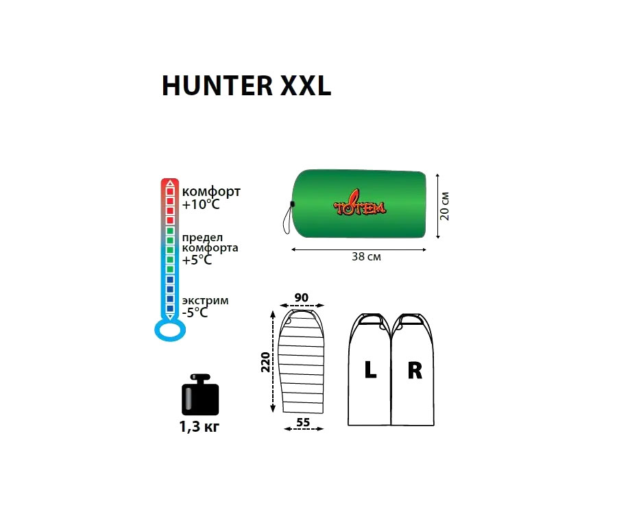 Tramp Totem Hunter XXL Olive – бюджетный трехсезонный (весна, лето, осень) спальный мешок, имеющий конструкцию кокон. Totem Hunter XXL – увеличенная модель, которая рассчитана на рослых широкоплечих людей. Это идеальный вариант для туристов, рыболовов, охотников и любителей отдыха на природе, которые хотят получить максимум комфорта при минимальных затратах. В качестве утеплителя в модели используется проверенный и хорошо всем знакомый HiTech Hollofiber, волокна которого имеют полый канал и спиралевидную форму, что позволяет удерживать большой объем воздуха и отлично сохранять тепло. Спальник не пропускает и не впитывает влагу. Даже в условиях повышенной влажности сохраняет тепло. Материал спальника Tramp Totem Hunter XXL отлично восстанавливается после сжатия, занимает минимальный объем, гипоаллергенен и не токсичен.