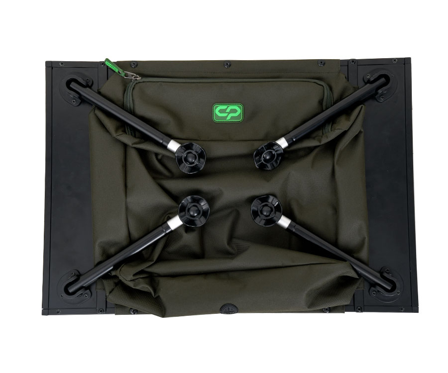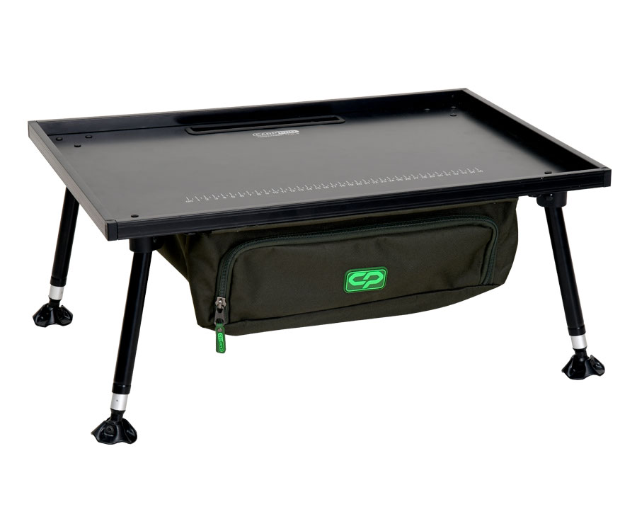 Монтажный стол Carp Pro Organizer Table – складной монтажный стол-органайзер, который предназначен для изготовления монтажей и оснасток во время рыбалки, подготовки снастей и размещения гаджетов. Края металлической столешницы оборудованы увеличенными бортиками, предотвращающими падение предметов со стола. Кроме того, столешница Carp Pro Organizer Table имеет слот для вертикальной или горизонтальной установки телефона и линейку от 0 до 35 см для измерения длины поводков. Четыре складные регулируемые по высоте ножки имеют телескопическую конструкцию и оснащены грязевыми пятами на шарнирах, что позволяет установить стол практически на любом рельефе берега и мягком грунте. Под столешницей размещена сумка из износостойкого материала 600D размером 38х36х12 см с молнией в передней части. В задней части сумки предусмотрено отверстие для вывода проводов и зарядных кабелей для гаджетов. Компактная складная конструкция стола Carp Pro Organizer Table обеспечивает максимальное удобство при транспортировке.