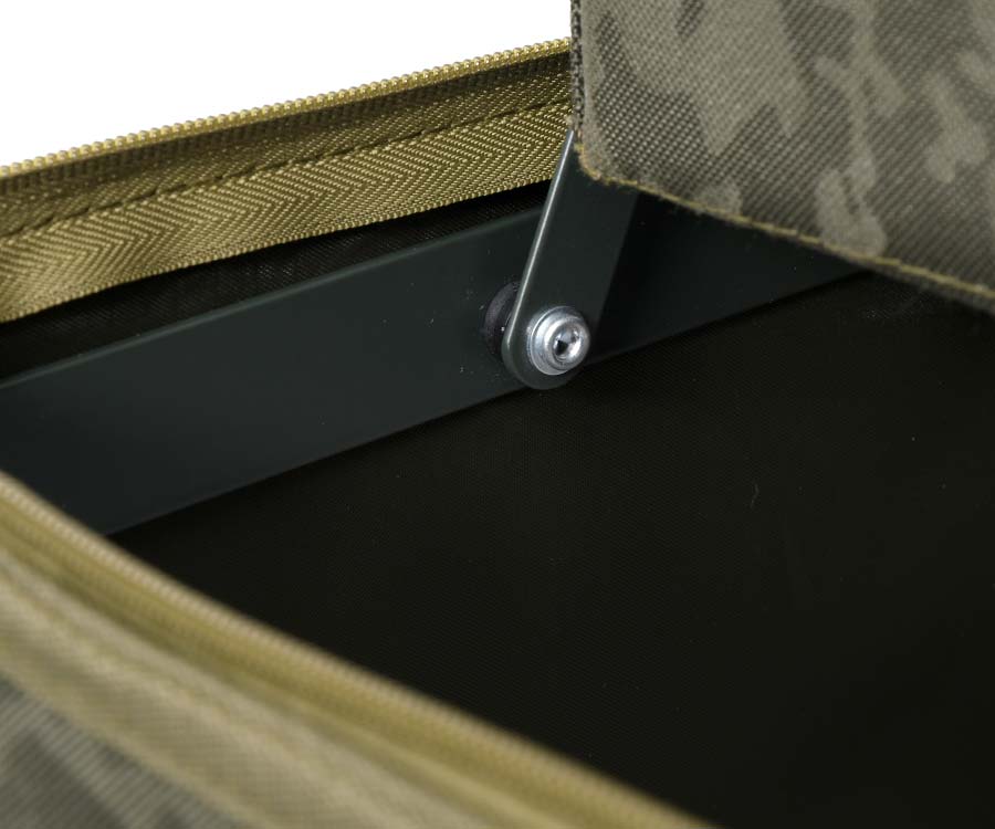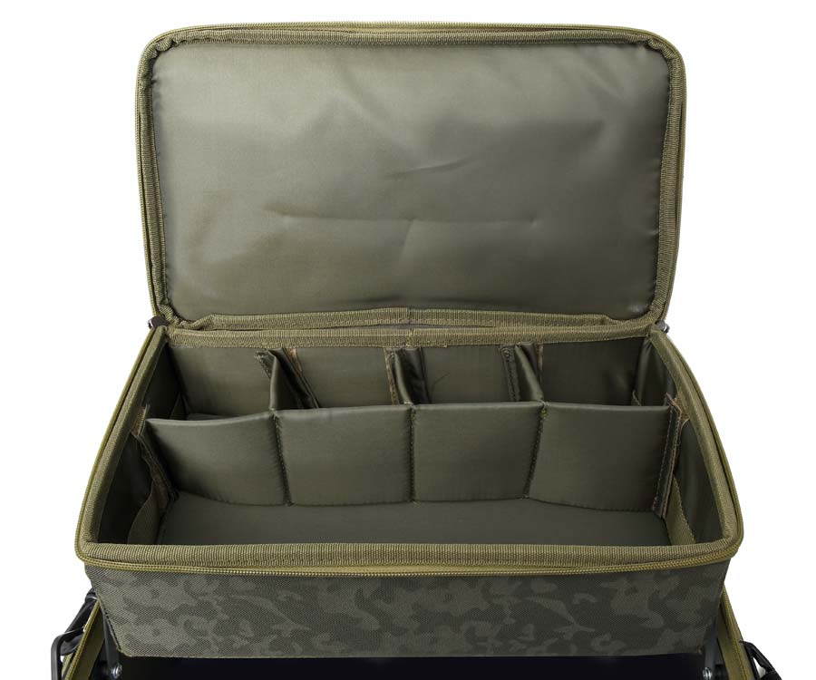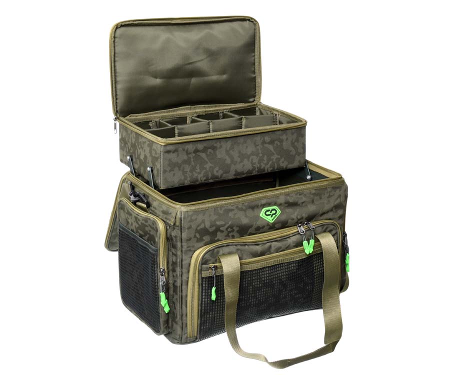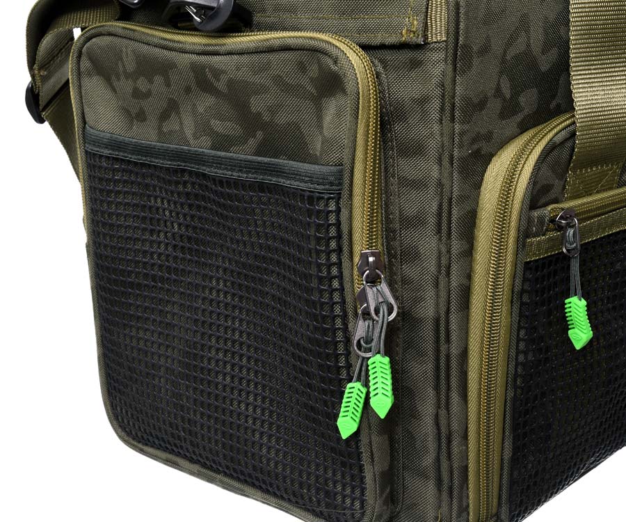 Доступ к вместительному внутреннему отделению осуществляется через фронтальный клапан на двусторонней молнии. Здесь прекрасно разместятся карповые катушки, коробки и боксы со снастями, прочее объемное снаряжение. На клапане предусмотрен накладной прозрачный сеточный карман. Вместительные боковые карманы также оборудованы прозрачными сеточными кармашками. На крышках и карманах установлены надежные молнии. Благодаря жесткости конструкции, сумка отлично держит форму и защищает содержимое от повреждений. Для удобства транспортировки предусмотрены прочные ручки и регулируемый наплечный ремень с мягкой накладкой.