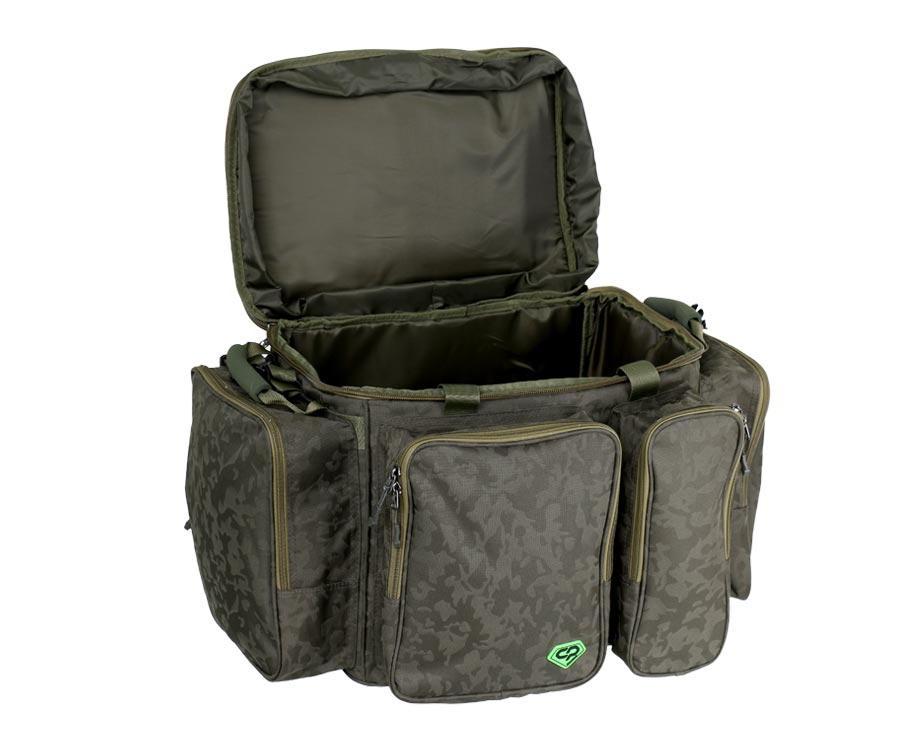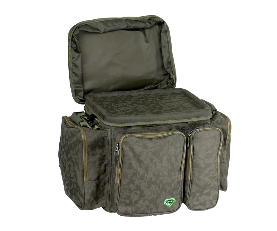 Большая и вместительная карповая сумка со столиком в комплекте. Сумка выполнена из прочного полиэстера и оснащена двумя фронтальными и двумя боковыми карманами на молниях. Замки молний оборудованы прорезиненными пуллерами. Столик имеет тканевое основание с упругим наполнителем. Такое решение позволяет установить стол горизонтально даже на неровной поверхности. Размер столика — 42×31×6 см. Достаточно высокий бортик по периметру стола не позволит скатиться и упасть вещам или рыболовным аксессуарам на землю. Кроме того, столик можно закрепить непосредственно на сумке сверху — для этого предусмотрены две Fastex защелки. Для удобства транспортировки предусмотрены две ручки с неопреновой накладкой и регулируемый наплечный ремень с эргономичной вставкой.