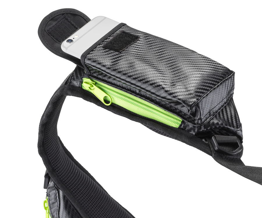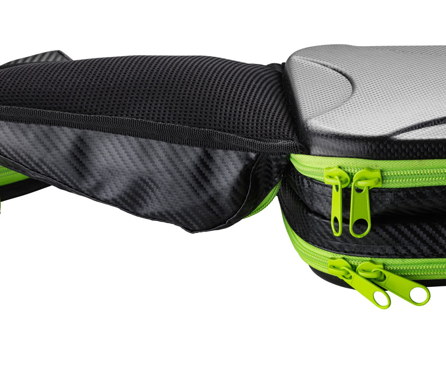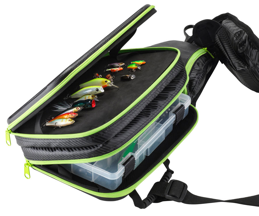 Удобная, наплечная сумка. Крышка сумки выполнена из стильного материала, имитирующего карбоновое волокно. Сумка имеет два отделения для приманок и аксессуаров. Первое отделение с вкладышем из материала EVA предназначено для безопасного хранения блесен, воблеров, мягких приманок с джиг-головками. Во втором отделении расположена коробка для мелочей и приманок. Коробка крепится с помощью «липучки». Широкий, наплечный ремень обеспечивает комфорт во время транспортировки. Кроме того, на ремне имеется вместительный карман для документов, ключей и другой «мелочевки».
