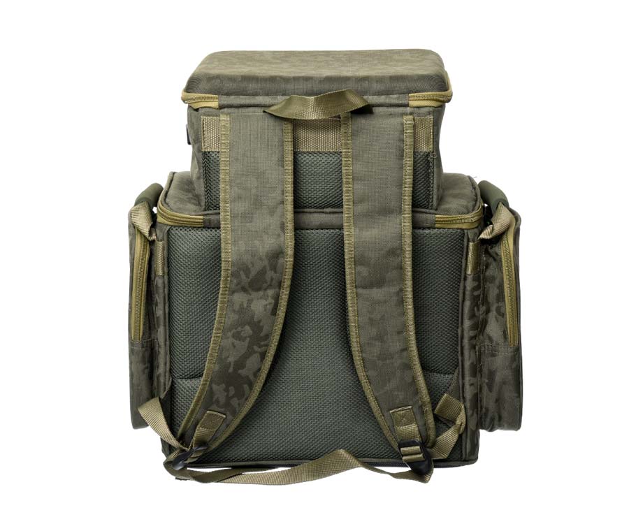 Carp Pro Diamond Ruckback – вместительная сумка-рюкзак для рыболовного снаряжения, вещей и аксессуаров. Изготовлена из фирменного влагостойкого камуфлированного материала Oxford 650D. Оснащена непромокаемым днищем из ПВХ. Большое основное отделение закрывается на двустороннюю молнию, имеет съемную жесткую перегородку на липучках и способно вместить все необходимое как для коротких рыболовных сессий, так и для длительных выездов. Сверху на клапане Diamond Ruckback расположен бокс со съемными перегородками на 3 отделения, предназначенный для всевозможных мелочей, электронных гаджетов и прочего снаряжения. Бокс имеет встроенный шнур для Power Bank с внешним разъемом USB для подзарядки мобильных телефонов и прочих устройств. В закрытом состоянии может использоваться как монтажный столик. Кроме того рюкзак оборудован вместительным фронтальным карманом и двумя боковыми на молниях, где удобно разместятся небольшие коробочки с терминальными снастями и аксессуарами. Для небольших пакетиков и инструментов предусмотрен плоский накладной кармашек на молнии, а для карабинов и ретриверов – прочные петли. Мягкая вентилируемая спинка, ручки для переноски с накладками из EVA и две регулируемые широкие лямки обеспечивают максимальное удобство при транспортировке CarpPro Diamond Ruckback.