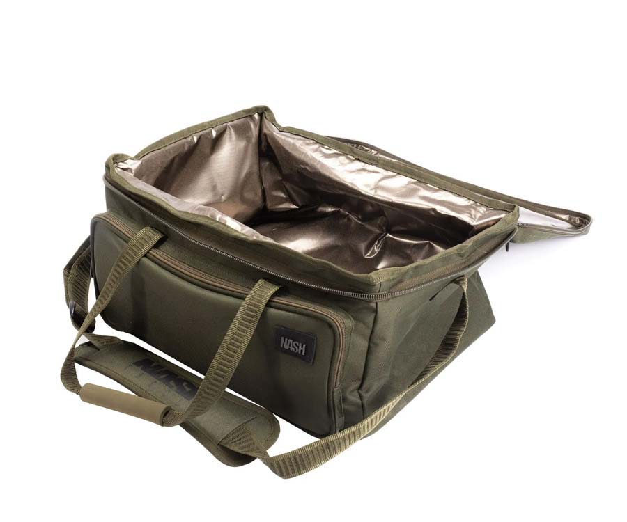 Фирменная вместительная сумка-холодильник Nash Cool Bag оборудована достаточно удобным изотермическим отделом. Она незаменима не только на рыбалке, но и в любом туристическом походе или выезде на природу. Производители полностью изменили дизайн переносного холодильника, отдав предпочтение ширине, нежели высоте. Теперь в один ряд проще укладывать самые разнородные продукты и наживки, ведь сумка отлично справляется с удержанием холода. В сумке помещается до 7 кг бойлов. А специальная подкладка способна сохранять содержимое до 48 часов. Сбоку сумки размещен огромный карман, закрывающийся с помощью молнии. Переносной холодильник оснащен регулируемым плечевым ремнем и двумя ручками для транспортировки со вставками из мягкого EVA-материала. Подкладка внутри легко протирается салфеткой.