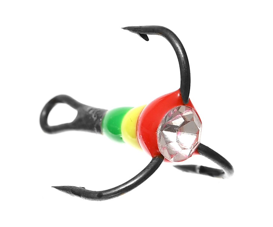 Тройник с флуоресцентной цветной каплей «светофор» и стразой зачастую используют для повышения уловистости балансиров. Также прекрасно зарекомендовал себя он в качестве подвески в зимних блеснах для отвесной ловли. Впрочем, он хорош и как самостоятельная приманка. Благодаря ярким флуоресцентным цветам капли эта искусственная приманка великолепно заметна в темной воде даже на больших глубинах. Тройник имеет высокое качество изготовления, очень острые жала, цвет – black nickel. Цвет капли: зеленый + желтый + красный.