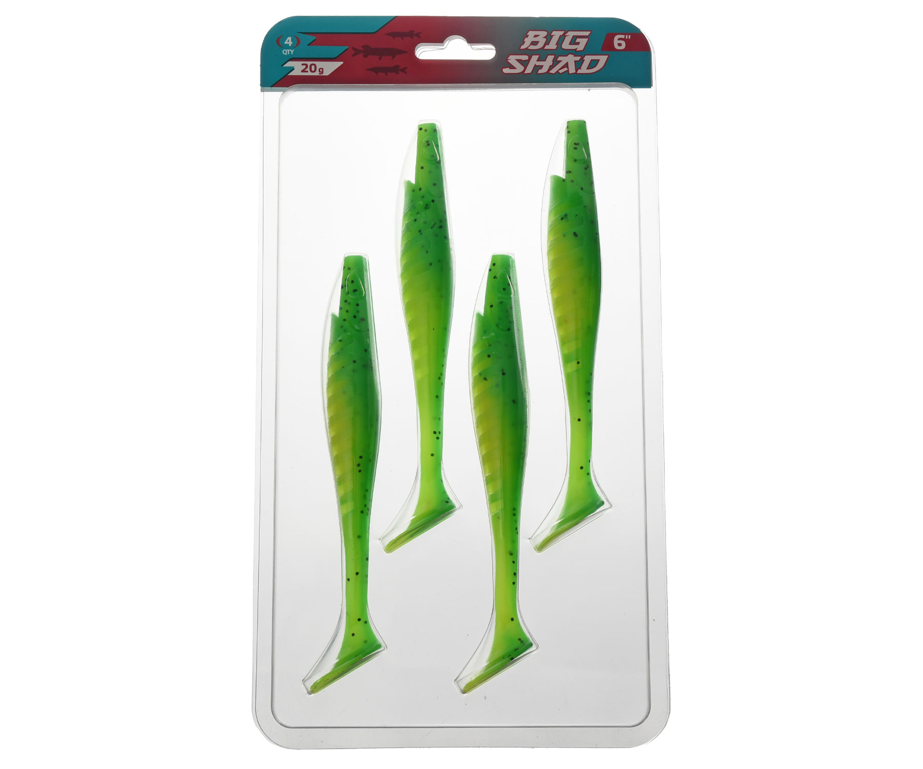 Flagman Big Shad 6" – крупный виброхвост удлинённой формы, изготовленный из мягкого силикона. Тело приманки сплющено с боков, сверху и снизу имеются специальные прорези, оптимизирующие использование Flagman Big Shad с офсетным крючком. Благодаря объёмной пятке виброхвост начинает играть даже при самой медленной проводке. Игра его лёгкая и размашистая. Колебания хвоста передаются на тело, благодаря чему приманка раскачивается при проводке, привлекая хищника с больших расстояний. На теле Big Shad имеются специальные насечки, которые создают привлекательную для хищника турбулентность. Приманка отлично работает на классической джиг-головке, шарнирном монтаже, штопоре. Модель прекрасно подойдёт для ловли трофейного судака, щуки и сома. Большой рыбе – крупная приманка, – это как раз о Flagman Big Shad!