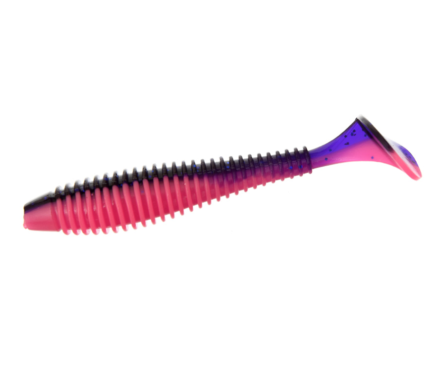 Серия Flagman Mystic Fish Fat отличается ребристым, округлым в сечении «упитанным» телом, которое переходит в сплющенный с боков хвостик. На нем расположена достаточно большая хвостовая пластина – «пятка». Частые ребра на теле служат дополнительным привлекающим элементом. С одной стороны они создают соблазнительные для хищника завихрения воды, а активную игру хвостика и турбулентность хищник чувствует с большого расстояния, с другой – многократно увеличивают площадь поверхности приманки, благодаря чему в окружающую среду попадает большее количество аттрактанта, которым пропитана приманка. Для удобства использования в спинке виброхвоста сделана специальная прорезь, куда идеально прячется жало офсетного крючка, что значительно повышает незацепляемость приманки.