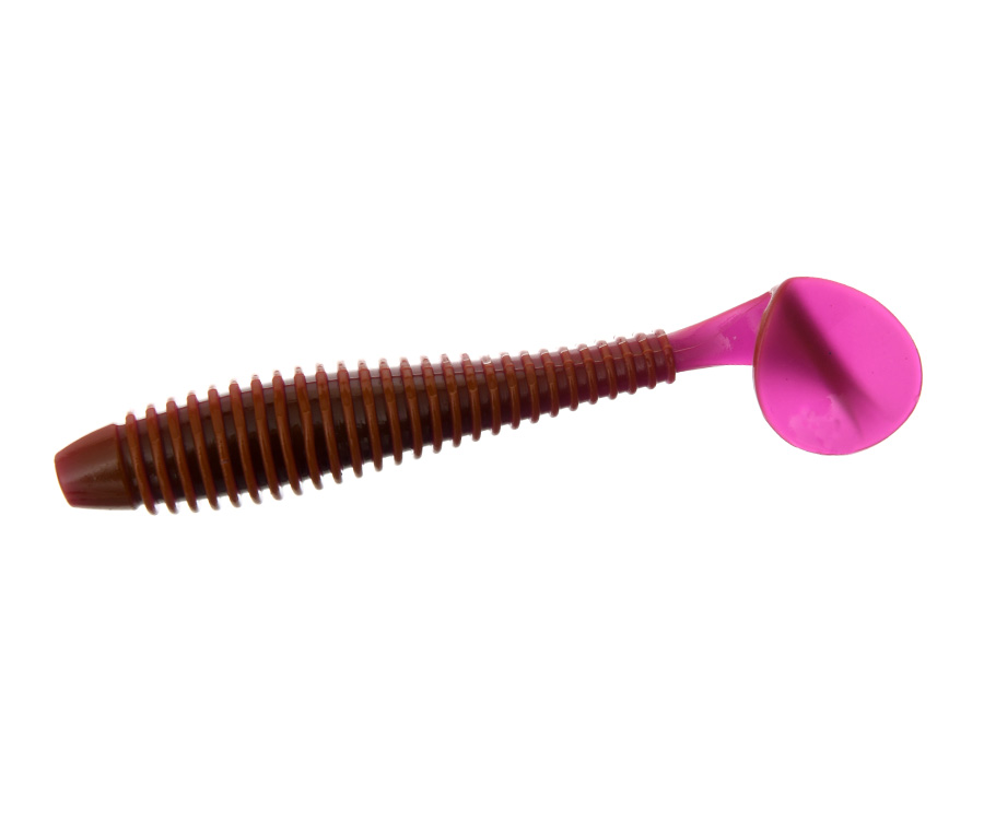 Серия Flagman Mystic Fish Fat отличается ребристым, округлым в сечении «упитанным» телом, которое переходит в сплющенный с боков хвостик. На нем расположена достаточно большая хвостовая пластина – «пятка». Частые ребра на теле служат дополнительным привлекающим элементом. С одной стороны они создают соблазнительные для хищника завихрения воды, а активную игру хвостика и турбулентность хищник чувствует с большого расстояния, с другой – многократно увеличивают площадь поверхности приманки, благодаря чему в окружающую среду попадает большее количество аттрактанта, которым пропитана приманка. Для удобства использования в спинке виброхвоста сделана специальная прорезь, куда идеально прячется жало офсетного крючка, что значительно повышает незацепляемость приманки.