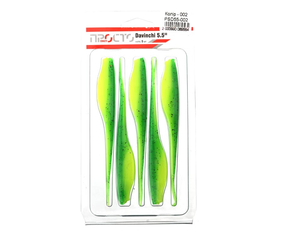 «Просто снасті» Davinchi 5.5" – типичный слаг с сильно вытянутым и сплющенным по бокам телом. На кончике длинного хвоста расположены два тонких усика, которые призваны увеличить подвижность приманки во время анимации. Собственной игры слаг Davinchi не имеет, так как полностью лишён активных элементов. Сверху и снизу тела имеются углубления для оптимизации использования приманки в оснастках с офсетным крючком. Это идеальная приманка для оснастки дроп-шот. Также ее с успехом используют в других оснастках, как шарнирных, так и разнесённых. Все приманки «Просто снасті» Davinchi изготовлены из мягкого эластичного пластика в наиболее популярных расцветках. Davinchi – востребованная приманка у любителей ловли крупного судака и щуки, с очень привлекательным соотношением цена/качество.
