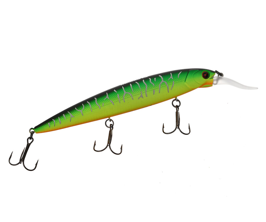Воблер Flagman Challenger-Minnow 132SF – крупный минноу вытянутой формы с необычной формой лопатки, которая придает ему неповторимую игру как на равномерной, так и на рывковой проводке. Эта медленно всплывающая приманка сбалансирована таким образом, что занимает в воде практически горизонтальное положение, не теряя привлекательности для рыбы даже во время продолжительных пауз. В шумовой камере находится всего один шарик, который создает негромкие, привлекающие хищника звуки. Весь свой потенциал Flagman Challenger-Minnow 132SF раскрывает на твичинге: активно рыская по сторонам, выполняя широкие галсы, колеблясь вокруг собственной оси и медленно всплывая на паузе. Воблер также отлично показывает себя в облове средних глубин при помощи равномерной проводки или проводки Stop & Go. Причем равномерная проводка в среднем темпе зачастую оказывается наиболее результативной при ловле щуки. Для твичинга Flagman Challenger-Minnow лучше использовать мощное и жесткое удилище, которое сможет придать ему нужное ускорение. Наилучшие результаты воблер показывает при ловле щуки и судака на глубинах до четырех метров, где способен привлекать хищника с больших расстояний.