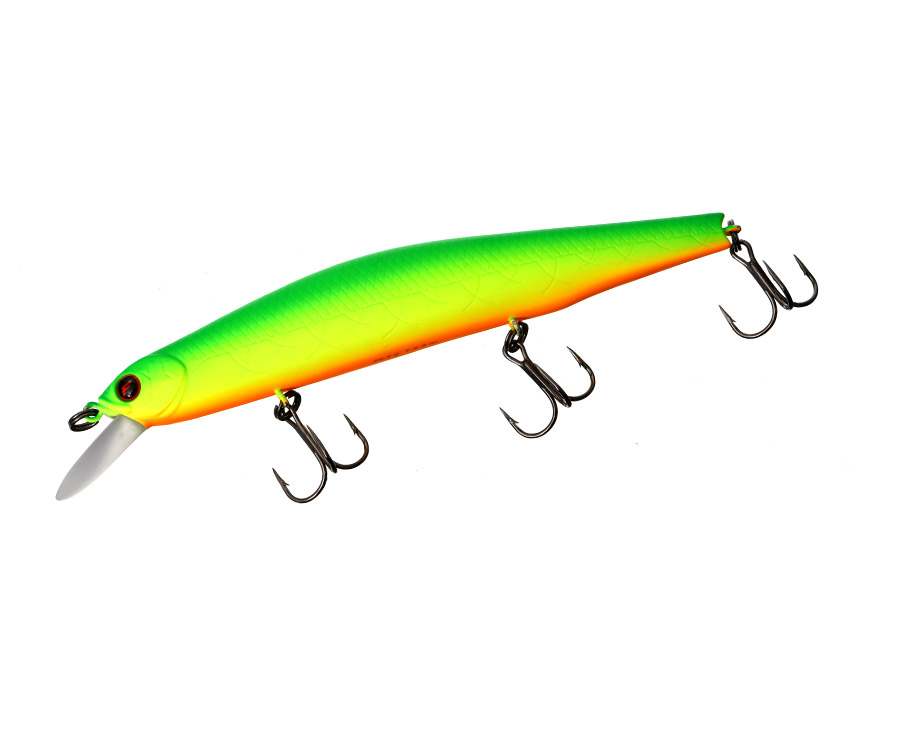 Flagman Joker 110SP – один из классических воблеров минноу, созданных специально для рывковой проводки. Эта шумящая и очень звонкая приманка изготовлена из высококачественного пластика, имеет прочную многослойную окраску, оснащена острейшими крючками VMC и усиленными заводными кольцами. Воблер Flagman Joker 110SP оборудован магнитной системой дальнего заброса и балансировки. Он обладает нейтральной плавучестью (суспендер), что позволяет долго удерживать его в самых привлекательных точках проводки. Имеет слабовыраженную малоактивную собственную игру, поэтому использовать равномерную проводку целесообразно лишь против течения или при высокой скорости подмотки. На рывковой проводке, для которой воблер и предназначен, он раскрывается полностью: делает длинные уходы в стороны по дугообразной траектории, а после остановки продолжает некоторое время покачивать боками, демонстрируя затухающий роллинг. Flagman Joker 110 – настоящий универсал, способный прекрасно работать на любом темпе рывковой проводки. Он показывает безупречные результаты как на агрессивной ударной проводке, так и на мягком затухающем твичинге. Ряд моделей покрыты 3D фольгой («битое стекло»), а также уникальной краской, которая светится в ультрафиолете, отчего воблер буквально сияет всем телом в толще воды, привлекая хищника с больших расстояний. Приманки Joker 110SP, в первую очередь, заинтересуют любителей ловли щуки. Впрочем, и охотники на судака по достоинству оценят возможности этих уникальных воблеров.