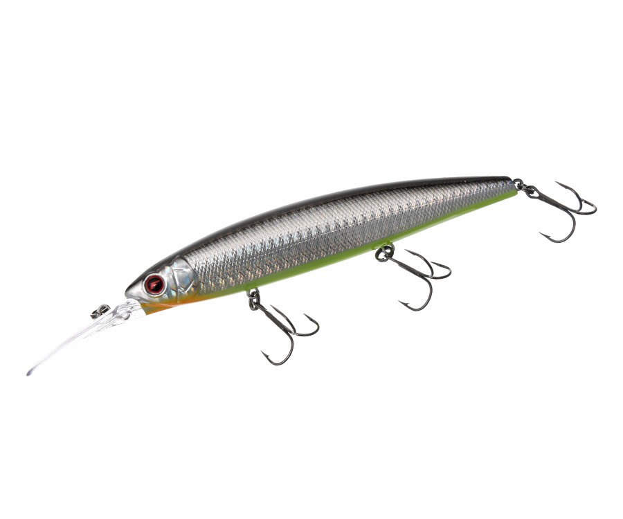 Flagman Kraken 130SF-DR – воблер геометрии минноу, который разработан специально для рывковой проводки. На равномерной проводке приманка обладает слабовыраженной собственной игрой, а вот при твичинге Flagman Kraken раскрывает весь свой потенциал. Будучи довольно упористой приманкой, он несильно отклоняется в стороны, делая при этом достаточно длинные проходы и совершая во время движения наклоны из стороны в сторону. После остановки Kraken некоторое время покачивает боками, демонстрируя затухающий роллинг (rolling action), а затем начинает медленно всплывать, провоцируя таким поведением на атаку даже малоактивного хищника. Приманка обладает большим лобовым сопротивлением и, чтобы раскрыть ее потенциал, лучше использовать жесткие удилища, которые позволяют сделать мощный акцентированный рывок. Flagman Kraken 130 SF-DR способен работать на разных темпах рывковой проводки. Кроме того, отличные результаты он показывает и на резких потяжках. Воблер шумовой, оборудован магнитной системой дальнего заброса. Обладает небольшой положительной плавучестью, что, с одной стороны, позволяет обходить подводные препятствия, с другой – легко удерживать приманку в самых привлекательных горизонтах проводки. Комплектуется надежной фурнитурой, острыми и легкими тройниками VMC. Большинство моделей Kraken 130SF-DR покрыты уникальной краской, которая светится в ультрафиолете, что является дополнительным стимулом для хищника атаковать приманку.
