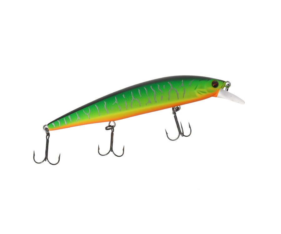 Воблер Flagman Robber-Minnow 110SP – воблер с нейтральной плавучестью из класса крупных минноу, разработанный для ловли щуки. Сильно вытянутая форма с приплюснутыми боками создаёт хорошую аэродинамику во время заброса и позволяет добиться очень привлекательной игры. Приманка оснащена магнитной системой дальнего заброса, состоящей из шара и магнита, который фиксирует его в рабочем положении. Во время заброса шар перемещается по специальному каналу, смещая центр тяжести в хвост приманки, за счёт чего полет воблера получается дальним и точным. Что касается игры приманки, Robber-Minnow 110SP – стопроцентный джеркбейт, не лишённый собственной игры на равномерной проводке. Однако наилучшие свои качества Flagman Robber-Minnow 110SP раскрывает на рывковой проводке. Причём рывки лучше выполнять в виде резких ударов, чего можно добиться только достаточно жёстким удилищем. При правильно подобранной проводке воблер широко и хаотично рыскает в разные стороны, порой разворачиваясь на 180 градусов, а каждое движение сопровождается привлекательным роллингом – затухающим покачиванием приманки вокруг своей оси. Все эти движения приманки невероятным образом действуют на рыбу и побуждают её к атаке. Flagman Robber-Minnow применяется для ловли щуки вдоль береговых свалов, камыша, кувшинок, а также на широких плёсах с глубинами 1-2,5 метра. Максимально результативные проводки – твичинг, Stop & Go, равномерная. Модель оснащена тремя острейшими тройниками, имеет выразительное голографическое покрытие и богатую цветовую гамму.