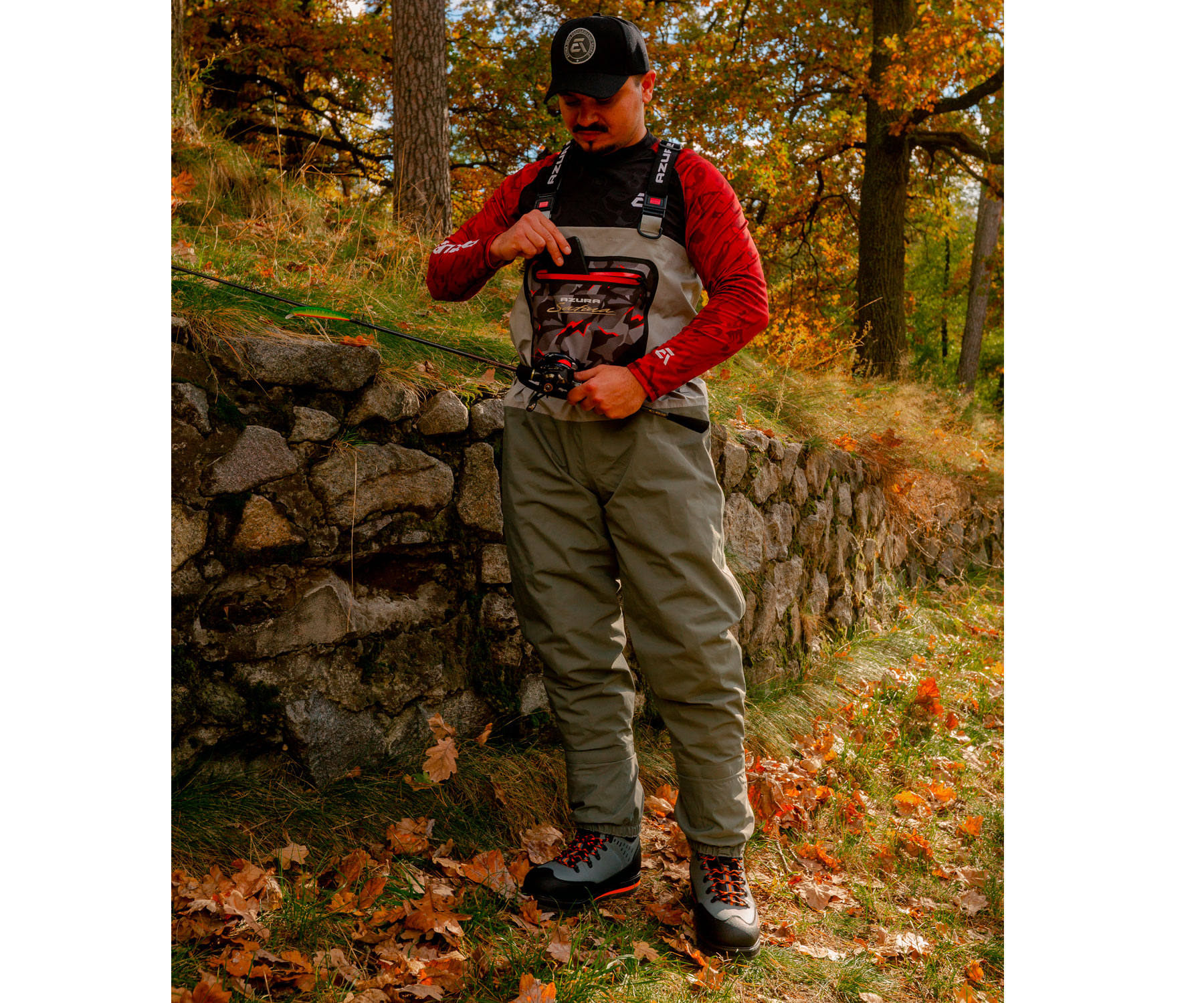 Забродный полукомбинезон Azura Safina Breathable Waterproof Chest Wader – лёгкие дышащие вейдерсы, которые идеально подойдут для рыбалки в самых разных погодных условиях. Этот забродный костюм изготовлен из лёгкого, обладающего высокой эластичностью и прочностью водонепроницаемого мембранного материала с интегрированными в него неопреновыми носками. Водонепроницаемость материала составляет 20000 мм водяного столба, а дышащая способность – 10000 г/кв.м за 24 часа. Все швы изделия надёжно проклеены, что исключает любые протекания воды и обеспечивает его полную герметичность. Удобные широкие шлейки полукомбинезона имеют надёжные пластиковые застёжки фастекс и регулируются по высоте в соответствии с ростом рыболова. Кроме того, в конструкции вейдерсов Azura Safina Breathable Waterproof Chest Wader предусмотрены шлёвки под ремень, регулируемый поясной ремень с застёжкой фастекс, а также вместительный нагрудный карман, закрывающихся на водонепроницаемую молнию. Мембранные вейдерсы Azura Safina Breathable Waterproof Chest позволяют находиться продолжительное время в воде, не испытывая дискомфорта, не боятся низких температур и устойчивы к воздействию ультрафиолетового излучения
