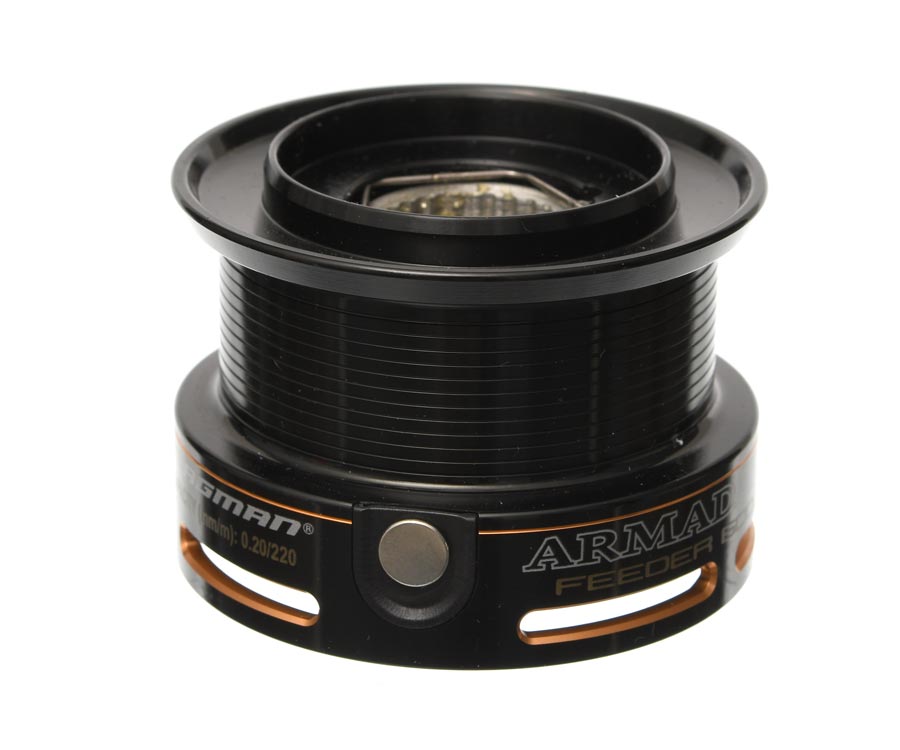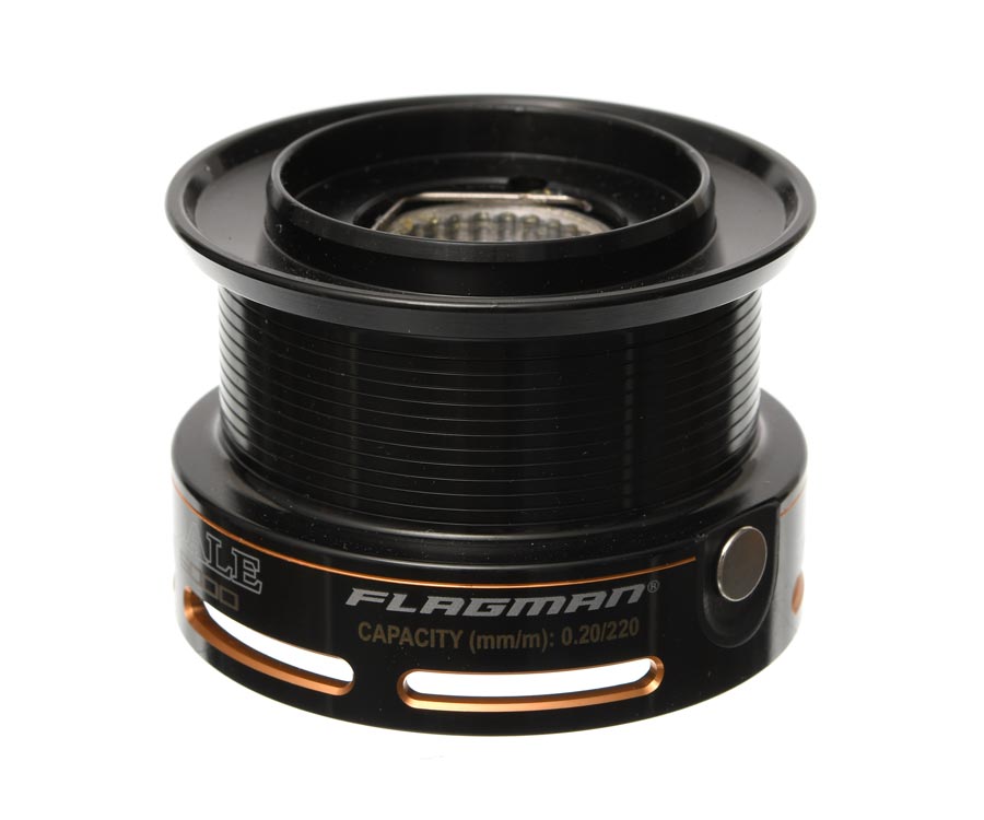 Запасная алюминиевая шпуля для фидерной катушки Flagman Armadale Feeder 6000. Оснащена круглой металлической клипсой. Вмещает 220 м лески диаметром 0,2 мм.