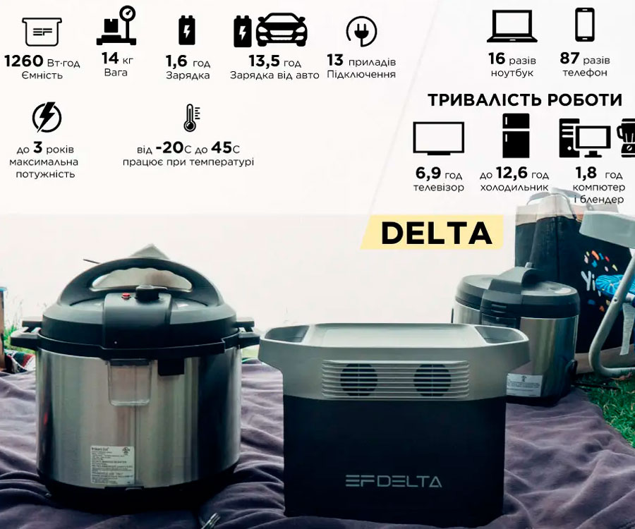 Зарядная станция EcoFlow Delta ёмкостью 1260 Вт/ч с литий-ионным аккумулятором LiFePO 4 гарантирует 800+ циклов зарядки с сохранением 80% ёмкости. Станция Delta обладает универсальным простым дизайном и компактным весом 14 кг. Портативна электростанция EcoFlow Delta имеет защиту для мониторинга напряжения, тока и температуры. Быстрая зарядка станции: 0-80% за 1 час и 0-100% за 1,6 ч. Будьте всегда готовы к аварийным отключениям электроэнергии или незапланированным поездкам. DELTA поддерживает функцию ИБП начального уровня и требует другого подхода к его использованию, чем профессиональные специализированные устройства ИБП. Для такого использования необходимо раз в 4-5 дней проводить циклы разряда и заряда (100-0-100%). Это сохранит другие функции станции и продлит её работу. Заряжайте Delta от сети 220 В, солнечных панелей, автомобиля и генератора. Подключив солнечные панели EcoFlow Solar Panel, заряжайте портативную зарядную станцию: 1x солнечная панель 110 Вт: 14-28 часов; 2x солнечная панель 110 Вт (последовательно): 7-14 ч; 3x солнечная панель 110 Вт (последовательно): 5-10 ч; 4x солнечная панель 110 Вт (параллельно): 4-8 ч. Обеспечьте постоянное энергообеспечение для 98% бытовых приборов вашего дома с помощью EcoFlow Delta.