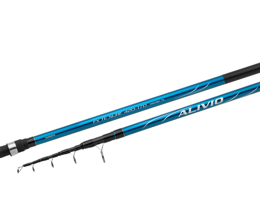 Shimano Alivio FX Surf TE – телескопічне серфове вудлище із серії морських вудлищ для берегової риболовлі, у яких вдало поєднано невисоку вартість та високі технічні показники. Бланк телескопічної конструкції виконано із карбону XT30. Оснащено монолітною вершинкою, яка дозволяє досягти високої чутливості, зберігаючи можливість здійснення далеких закидань. Shimano Alivio FX Tele Surf оснащено пропускними кільцями Shimano Stainless Steel Hardlite з потужними рамами з нержавіючої сталі та вставками з оксиду алюмінію. Надійний утримувач котушки Shimano DPS має гвинтову конструкцію з металевими кільцями-підсилювачами, тому котушка залишається завжди щільно зафіксованою, незалежно від навантажень. Спеціальне протиковзне покриття на руків’ї дає змогу впевнено утримувати вудлище під час закидання навіть у мокрих руках. Морське вудлище Shimano Alivio FX Surf TE компактно складається, тому не потребує особливих умов під час транспортування.