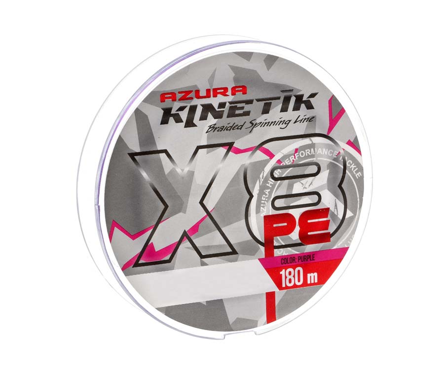 Azura Kinetik X8 – універсальний восьмижильний шнур, який призначено для широкого кола риболовів і різних технік спінінгової ловлі. Його виготовлено з високомолекулярного поліетилену (РЕ). Шнур Kinetik X8 має круглий перетин, рівну, гладку і слизьку поверхню, практично нульову розтяжність, забезпечує високу чутливість і максимально далеке закидання приманок. Шнур м'який, не шумить у кільцях як під час закидання, так і під час проведення. Крім того, Azura Kinetik X8 має спеціальне покриття, яке робить його стійким до механічних пошкоджень, перешкоджає всмоктуванню води та потраплянню абразивних часточок між волокнами. Його характерними рисами також є довговічність, висока міцність, точна відповідність реальних розривних навантажень заявленим, а також дуже привабливе співвідношення ціни та якості. Кількість доступних діаметрів дає змогу підібрати оптимальний шнур практично для будь-яких технік та умов ловлі.
