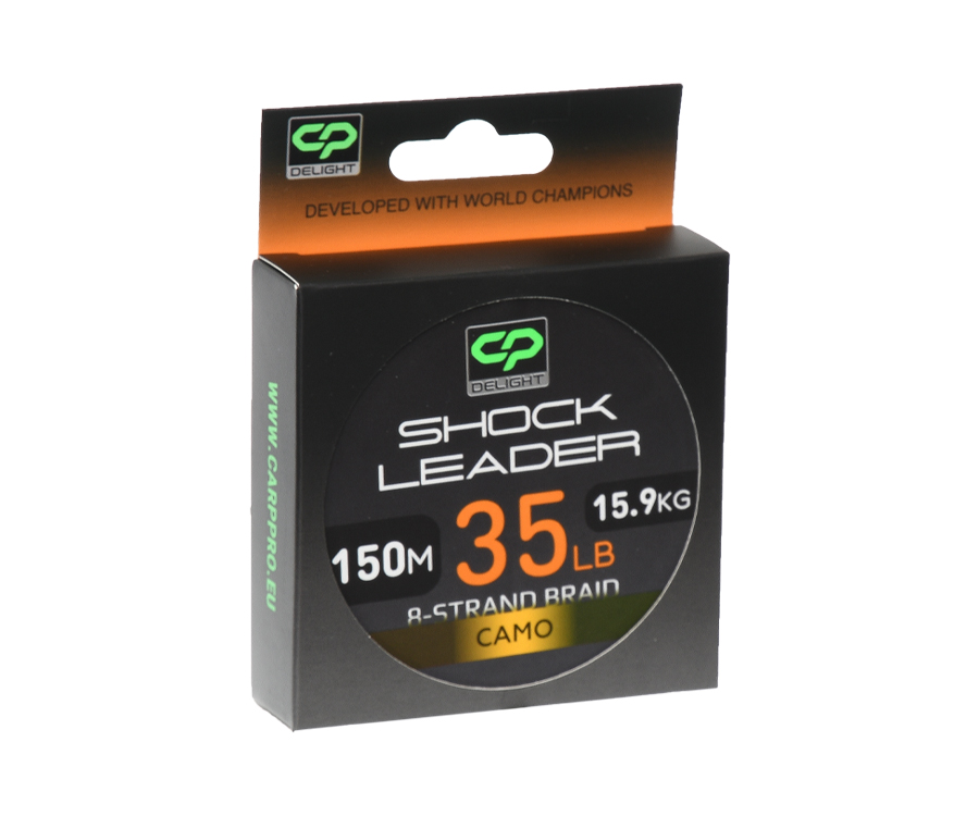 Шок-лідер Carp Pro Deligth Shock Leader Х8 Camo – високоякісний PE-шнур, який виготовлено за технологією восьмижильного плетіння. Спеціальне покриття поверхні шок-лідера та ідеально круглий перетин роблять його дуже слизьким і гладеньким, що дає змогу значно збільшити дальність закидання. Особлива технологія забезпечує Carp Pro Deligth Shock Leader Х8 високу щільність плетіння волокон, що значно підвищує його довговічність і абразивостійкість. Тонучі шок-лідери серії Deligth Shock Leader Х8 призначено для широкого кола любителів коропової риболовлі. Вони малопомітні для риби, мають високу міцність, зокрема, на вузлах, мінімальну розтяжність, високу чутливість і довговічність. Залежно від моделі розривне навантаження становить 35 і 45 Lb. Колір: камуфляж. Розмотування: 150 м.