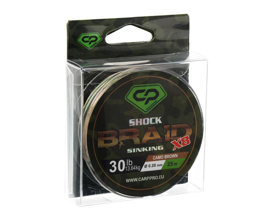 Шок-лідер Carp Pro Diamond Shock Braid Х8 – високоякісний PE-шнур, який виготовлено за технологією восьмижильного плетіння. Спеціальне покриття поверхні шок-лідера та ідеально круглий перетин роблять його дуже слизьким і гладеньким, що дає змогу значно збільшити кастингові характеристики снасті. Особлива технологія забезпечує Carp Pro Diamond Shock Braid Х8 високу щільність плетіння волокон, що підвищує його довговічність та абразивостійкість. Тонучі шок-лідери серії Diamond Shock Braid Х8 створені для широкого кола любителів коропової ловлі. Вони малопомітні для риби, мають високу міцність, зокрема й на вузлах, мінімальну розтяжність, високу чутливість і довговічність. Колір: коричневий камуфляж. Розмотування: 25 і 50 м.