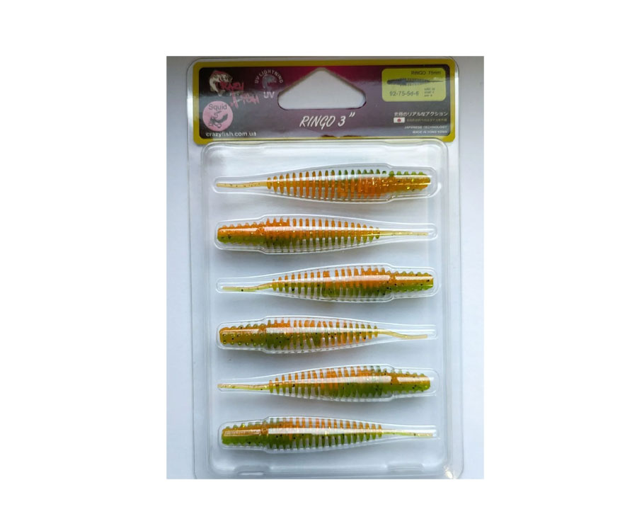 Crazy Fish Ringo — одна з кращих пасивних приманок. Завдяки геометрії тіла приманки у воді вона здійснює неймовірно реалістичні рухи, що нагадують комаху, личинку або черв'яка. Досить легкого імпульсу кінчиком спінінга і Ringo оживає. Її гра спокушає практично усіх наших риб, як хижих так і мирних! Ringo незамінний при полюванні на окуня. Приманку можна використовувати як на класичному монтажі з джиг-голівкою, так і на шарнірі або відвідному повідці.