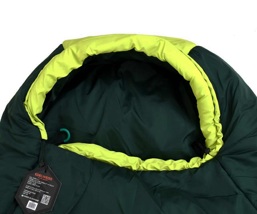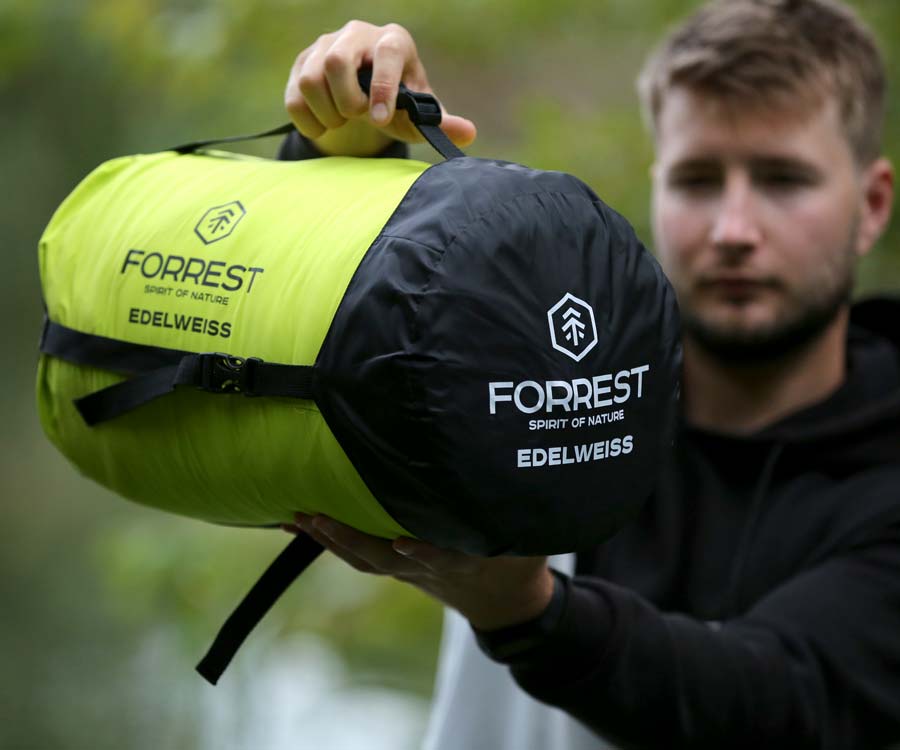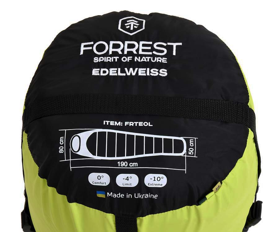 Forrest Edelweiss – якісний трисезонний спальний мішок типу «Кокон», який ідеально підійде для риболовлі, мисливства, кемпінгу та туристичних походів. Верхній шар без проблем впорається з ранковою росою й навіть легкою мрякою, а внутрішній шар і наповнювач збережуть тепло навіть за низьких температур. Сучасний утеплювач нового покоління Termoloft Active, який застосовано в спальному мішку Forrest Edelwiss, створено для збереження максимальної кількості тепла за мінімальної ваги та наділено унікальними робочими характеристиками. Спальник оснащено надійною двосторонньою блискавкою, що відкривається як зовні, так і зсередини. Теплова планка розташована по всій довжині замка та служить захистом від втрати тепла, а світловідбиваюча стрічка – для покращення системи захисту від закушування тканини блискавкою. У дизайні спальника передбачено: невелику кишеню 15х14 см на липучці, місце під подушку в капюшоні, утяжку капюшона, теплозберігаючий плечовий комір з утяжкою та петлі для сушіння. У комплекті чохол та компресійний мішок.