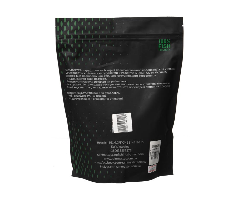 Rainmaster Spod Mix Only Fish – це ефективний спод-мікс, який створено за унікальною рецептурою, здобутою впродовж багатьох років на великій кількості змагань із коропової ловлі під час максимального пресингу на рибу. Спод-мікс Rainmaster Spod Mix Only Fish виготовлено виключно з натуральних якісних інгредієнтів, які не шкодять навколишньому середовищу та смакують рибі. Склад: більше 4 різновидів прикормочного пелетсу різної фракції, комплекс вітамінів, натуральні сухі ароматизатори. Ароматика: має яскраво виражений смак морських гадів (кальмар, восьминіг, мідія тощо). Містить: білки – 45%, жири – 15%. Вага: 1 кг.